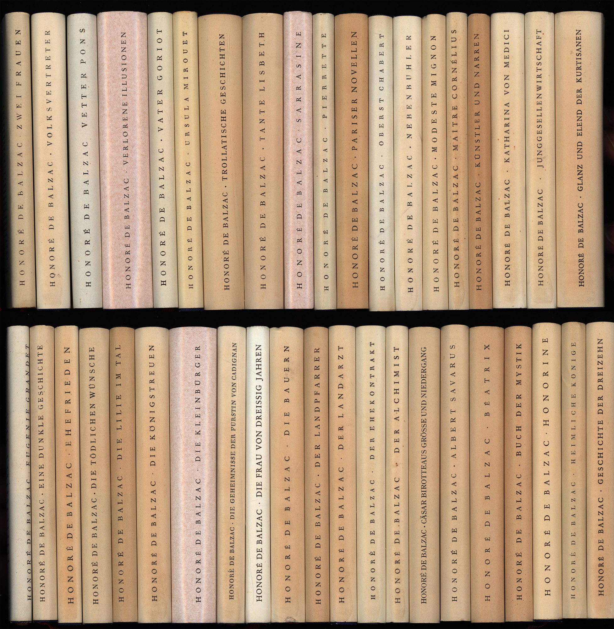 Mischauflage der Neuausgabe [1.-3. Auflage]. Dünndruckausgabe. Darin: Eugenie Grandet (6.-9. Tausend). Eine dunkle Geschichte (1.-5. Tausend). Ehefrieden (6.-9. Tausend). Die tödlichen Wünsche (1.-5. Tausend). Die Lilie im Tal (1.-5. Tausend). Die Königstreuen (1.-5. Tausend). Die Kleinbürger (1.-5. Tausend). Die Geheimnisse der Fürstin von Cadignan (1.-5. Tausend). Die Frau von dreissig Jahren (1.-5. Tausend). Die Bauern (1.-5. Tausend). Der Landpfarrer (1.-5. Tausend). Der Landarzt (6.-9. Tausend). Der Ehekontrakt (1.-5. Tausend). Der Alchimist (6.-8. Tausend). Cäsar Birotteaus Größe und Niedergang (1.-5. Tausend). Albert Savarus (1.-5. Tausend). Béatrix (1.-5. Tausend). Buch der Mystik (1.-5. Tausend). Zwei Frauen (1.-5. Tausend). Volksvertreter (1.-5. Tausend). Vetter Pons (1.-5. Tausend). Verlorene Illusionen (10.-13. Tausend). Vater Goriot (1.-5. Tausend). Ursula Mirouet (1.-4. Tausend). Trollatische Geschichten (1.-5. Tausend). Tante Lisbeth (6.-9. Tausend). Sarrasine (1.-5. Tausend). Pierrette (1.-4. Tausend). Pariser Novellen (6.-9. Tausend). Oberst Chabert (1.-5. Tausend). Nebenbuhler (1.-5. Tausend). Modeste Mignon (1.-5. Tausend). Maitre Conrélius. Der verstoßene Sohn. (1.-6. Tausend). Künstler und Narren (1.-5. Tausend). Katharina von Medici (6.-8. Tausend). Junggesellenwirtschaft (10.-12. Tausend). Honorine (1.-5. Tausend). Heimliche Könige (1.-5. Tausend). Glanz und Elend der Kurtisanen (10.-12. Tausend). Geschichte der Dreizehn (6.-8. Tausend). „Modeste Mignon“ mit Namen von alter Hand in Tinte auf Titelblatt. Sehr gute Exemplare.