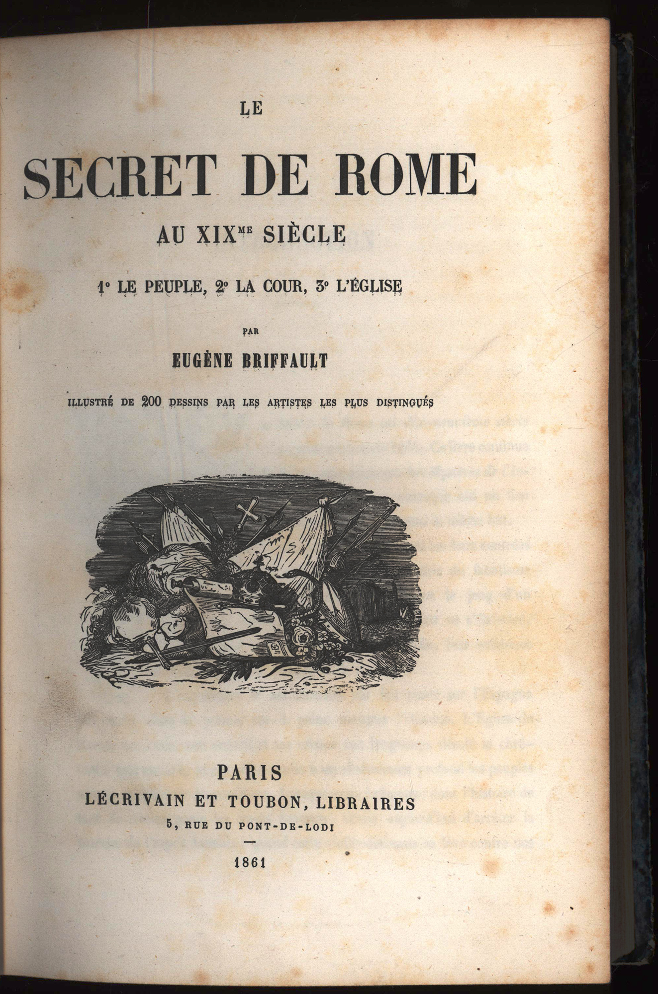 Briffault, Eugène: Le secret de Rome au XIXme siècle. 1° le peuple, 2° la cour, 3° l’eglise. Illustré de 200 dessins par les artistes les plus distingués. Paris, Verlag Boizard/Lécrivain et Toubon, 1846. 4°. 26 x 17,5 cm. VIII, 422 Seiten, [1] Blatt. Halblederband der Zeit auf 4 Bünden mit goldgeprägtem Rückentitel, goldgeprägten Fileten, marmoriertem Deckelbezug und marmoriertem Vorsatzpapier.