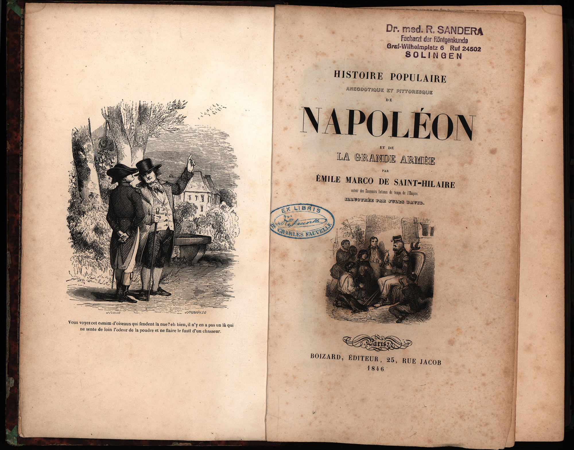 Saint-Hilaire, Emile Marco de: Histoire populaire anecdotique et pittoresque de Napoléon et de la Grande Armée. Illustrée par Jules David. Paris, Verlag Boizard, 1846. Groß-8°. 27 x 18 cm. 650 Seiten. Halblederband der Zeit auf 4 Bünden mit goldgeprägtem Rückentitel, marmorierten Vorsätzen und marmoriertem Deckelbezug.