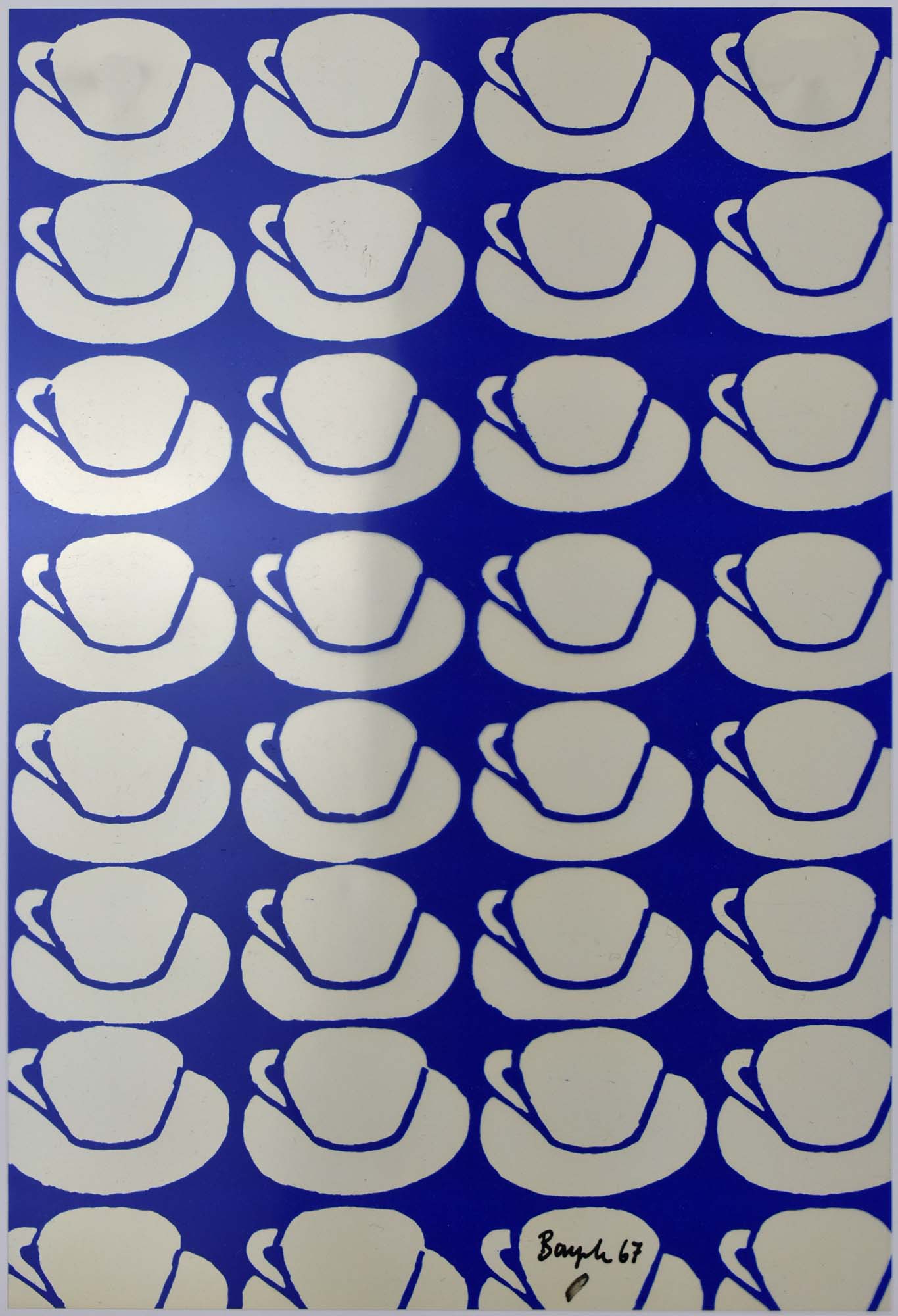 Unicum. Original screenprint by Thomas Bayrle in blue on transparent foil, signed with a black marker in the lower area of the print, dated (67). Size: 29.3 x 19.7 cm. Prework to „Coats“, raincoats made of PVC, screenprinted in red and blue with the iconic cup illustration, produced in a small edition of appr. 5-8 pieces in 1968. Another edition was produced 2008 with the same print on blue collar shirts. The raincoats in white, red and blue from 1968 were shown in a new installation at Art Basel 2025 by Galerie Neugerriemschneider. Provenance: From the estate of the art collector and author Ralf Seilheimer. Fine condition.