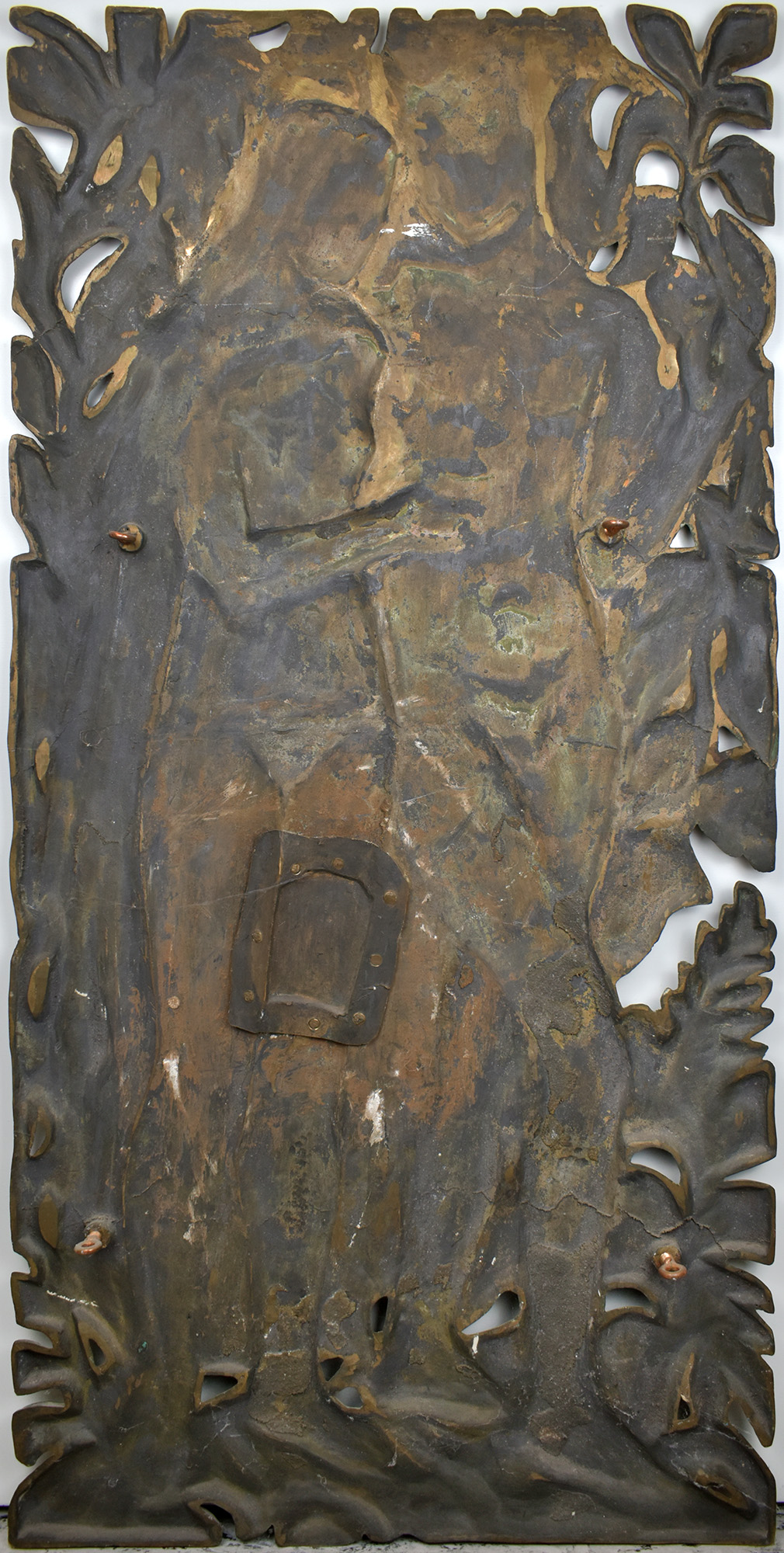 Bronze relief showing a nude couple with a book (reading), entwined by plants, not signed and without a founder’s mark. Size of the relief: appr. 117.5 x 56.0 cm. Lower lines of the relief with verdigris. With 4 solid copper hooks for mounting on the backside. Relief patched on the backside (appr. 15.5 x 12.0 cm), invisible on the frontside. Good condition.