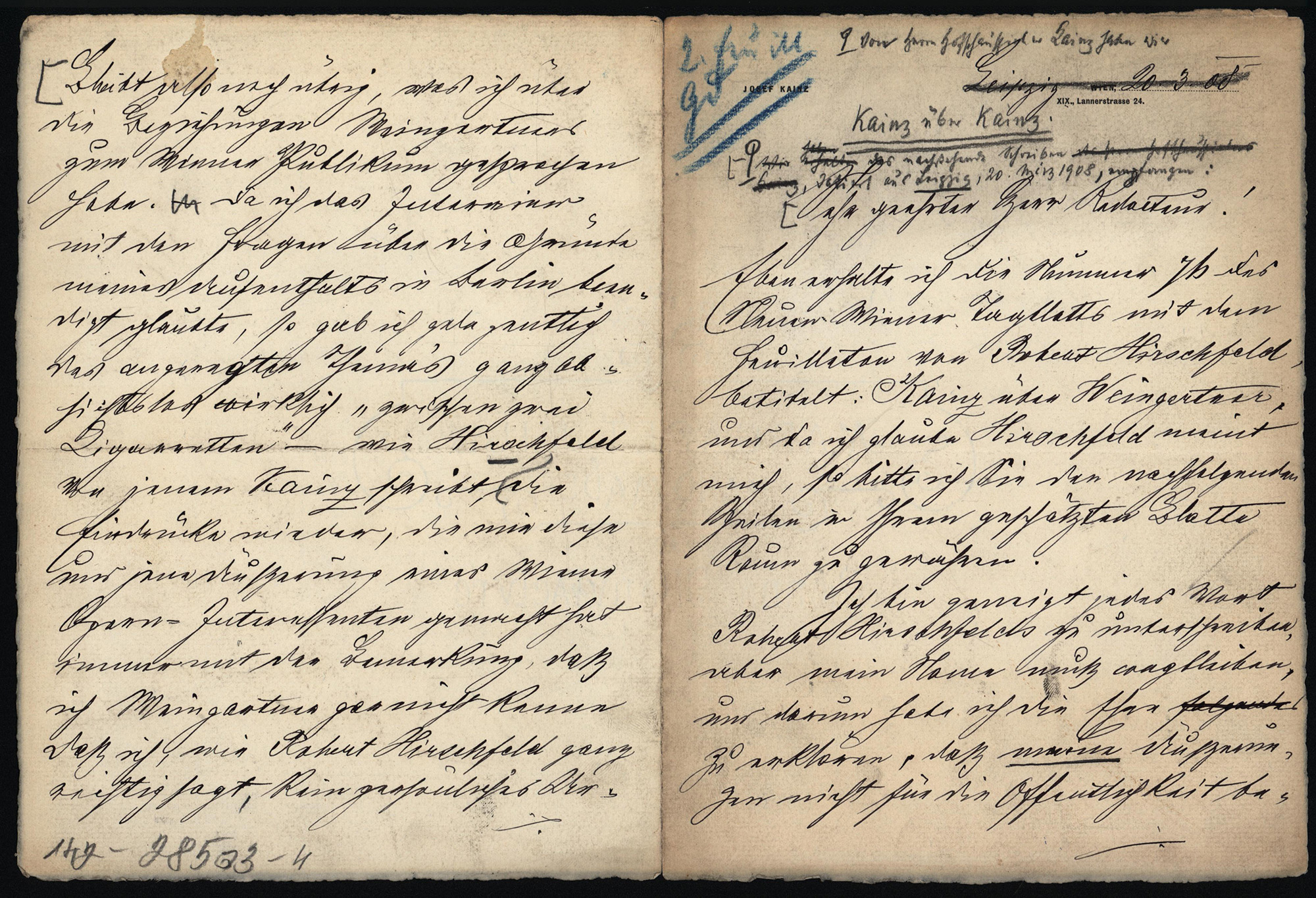 6-seitiger handschriftlicher Brief mit eigenhändiger Unterschrift von Josef Kainz in schwarzer Tinte auf 2 gefalteten persönlichen Briefbögen mit gedrucktem Namenszug an einen Redakteur bezüglich einer Opernkritik, datiert Leipzig, 20.3.08. Blattgrößen: 22,3 x 16,5 cm, ausgefaltet: 22,3 x 33,0 cm. Blätter angestaubt, mit vereinzelten Fleckchen, Seite 5 stärker staubfleckig. Erste Seite oben mit späteren handschriftlichen Vermerken mit Bleistift und blauem Buntstift, im Text einige kurze Unterstreichungen mit Bleistift. Guter bis sehr guter Zustand.