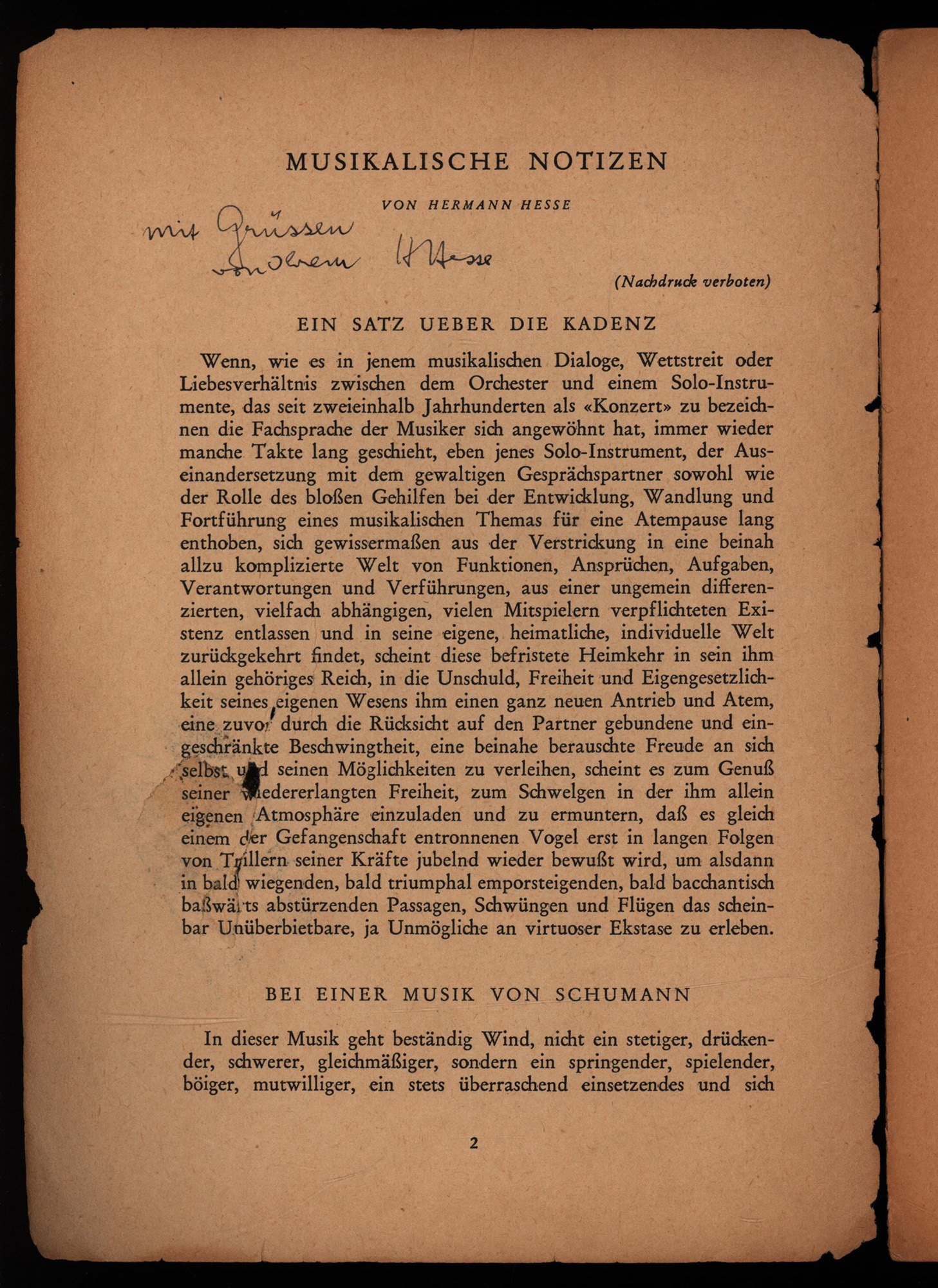 Hesse, Musikalische Notizen. [EA, signiertes Exemplar.]