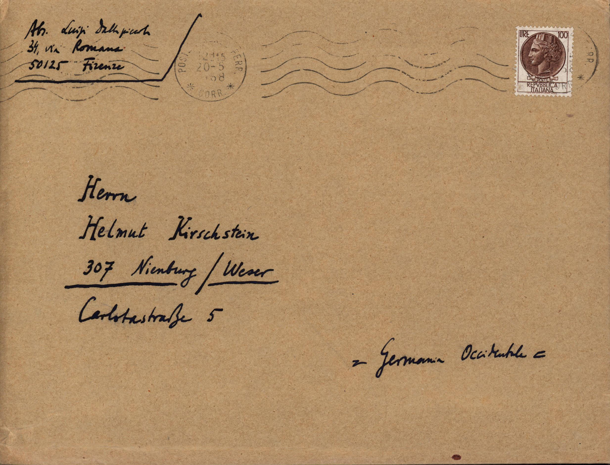 Notenpapier mit 3-stimmiger Notation von Luigi Dallapiccola in blauer Tinte, darunter als „Der Gefangene, Dritte Szene“ betitelt (meint seine italienische Oper „Il prigioniero“) und mit Widmung an Helmut Kirschstein „mit den besten Glückwünschen“ signiert. Blattgröße: 12,3 x 34,0 cm. Blatt mittig vertikal gefaltet. Mit dem beiliegenden gelaufenen Briefumschlag, von Luigi Dallapiccola handschriftlich adressiert. Sehr guter Zustand.