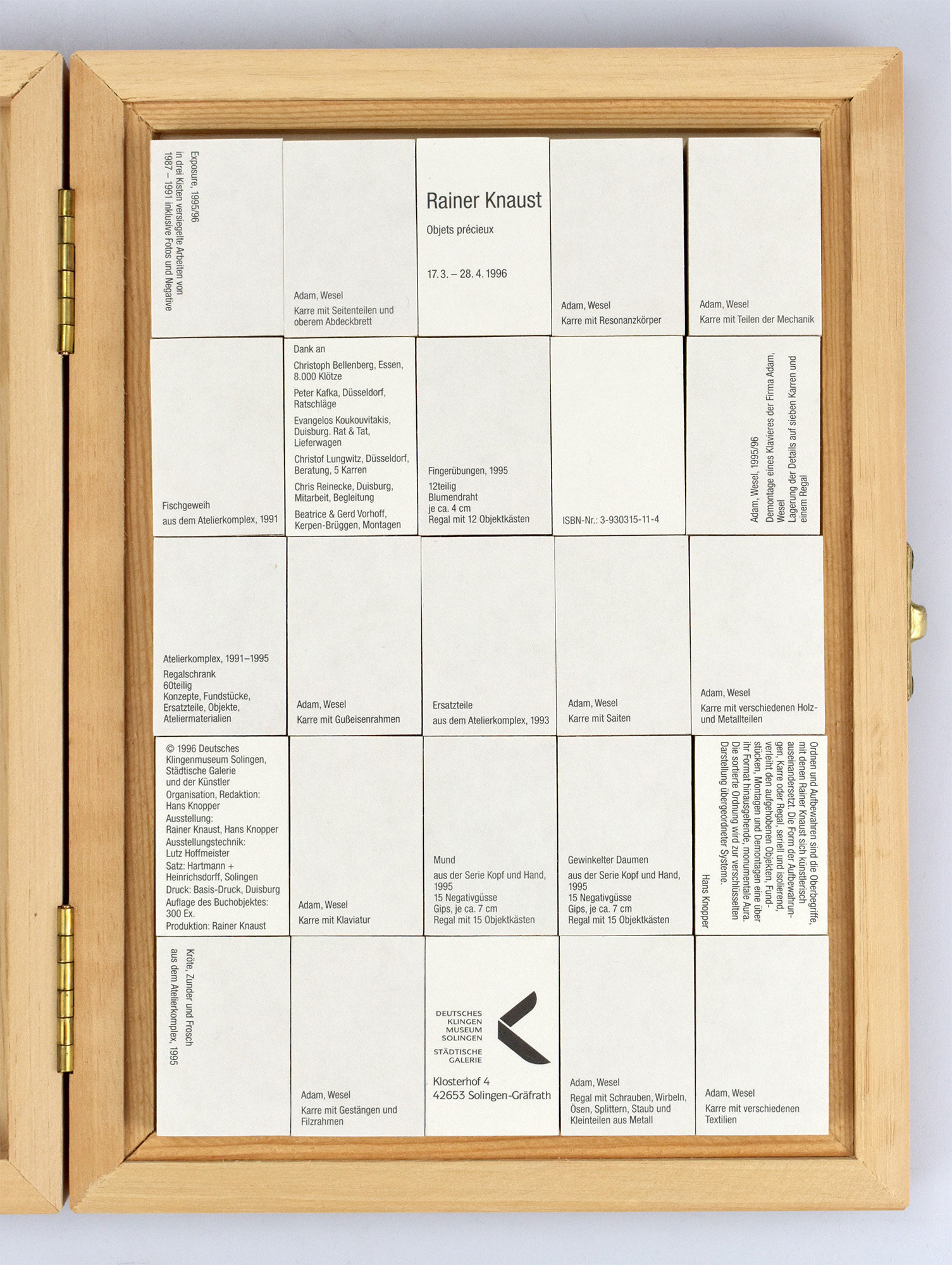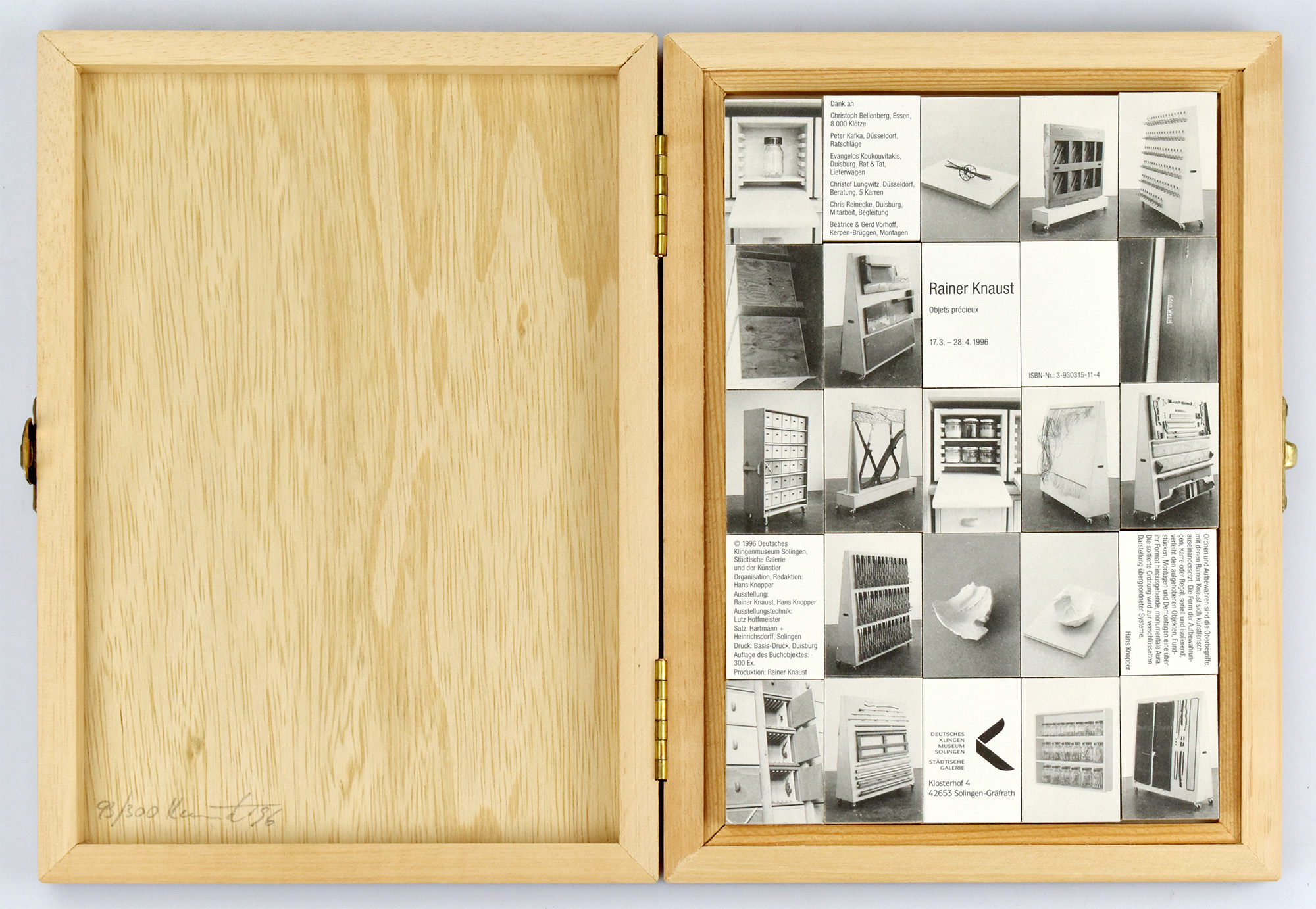 Knaust, Rainer – Knopper, Hans [Hrsg.]: Objets précieux. [Buchobjekt aus Holz, nummeriert und signiert.] Solingen-Gräfrath, Städtische Galerie, 1996.