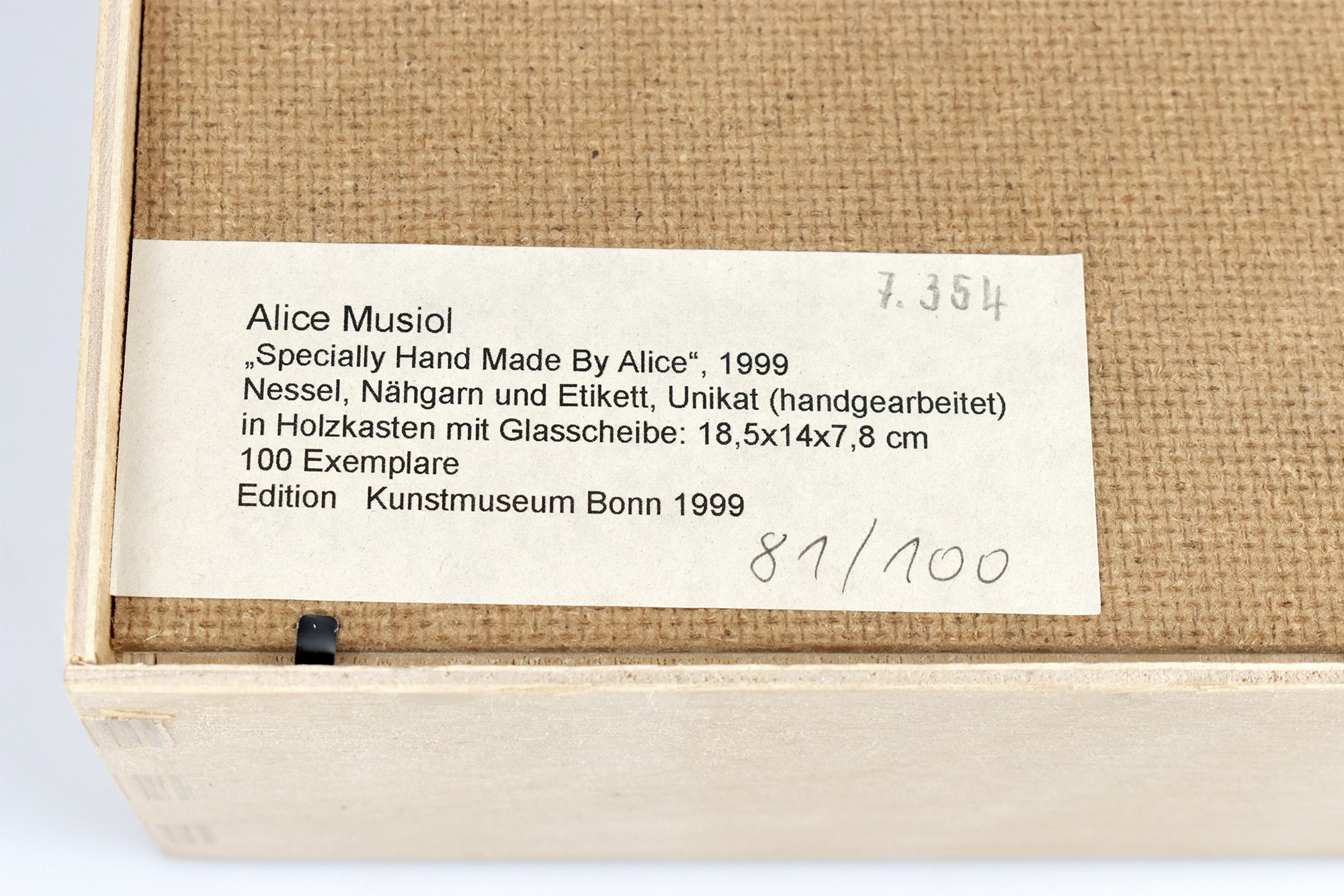 Nummer 81 von 100 Exemplaren der Edition des Kunstmuseum Bonn, 1999. Rundes textiles Objekt aus naturbelassenem gewebten Nessel; handgearbeitete, zusammengenähte Patchworkarbeit [aus 7 Teilen], Durchmesser: ca. 12 cm, seitlich mit angenähtem farbigen gewebten Etikett „Specially handmade by Alice“. In einer Holzbox mit Glasscheibe, Maße: 18,5 x 14 x 7,8 cm. Box rückseitig mit montiertem Papierschild, dort nummeriert und mit beschreibendem Text bedruckt, sowie mit 2 Haken zur Wandmontage. Provenienz: Aus dem Nachlass des Kunstsammlers und Autors Ralf Seilheimer, mit seiner Inventarnummer auf dem Papierschild auf der Rückseite. Sehr guter Zustand.