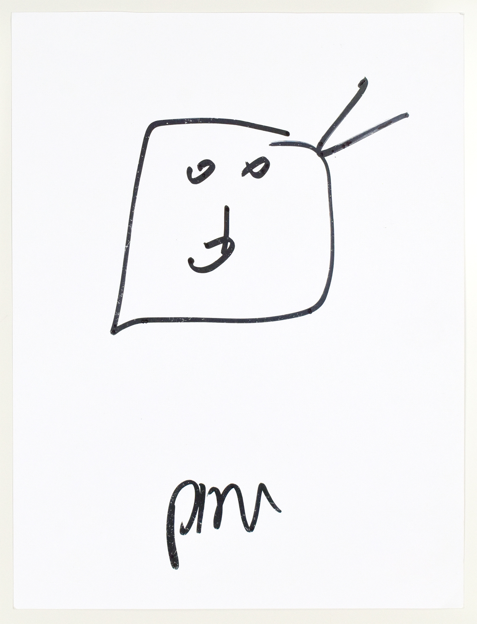 Original-Zeichnung von Nam June Paik mit schwarzem Filzstift (Permanentmarker) auf Papier, am unteren Blattrand signiert. Blattgröße: 27,7 x 21,0 cm. Provenienz: Aus der Düsseldorfer Sammlung eines ehemaligen Mitarbeiters der Kunsthalle. Sehr guter Zustand.