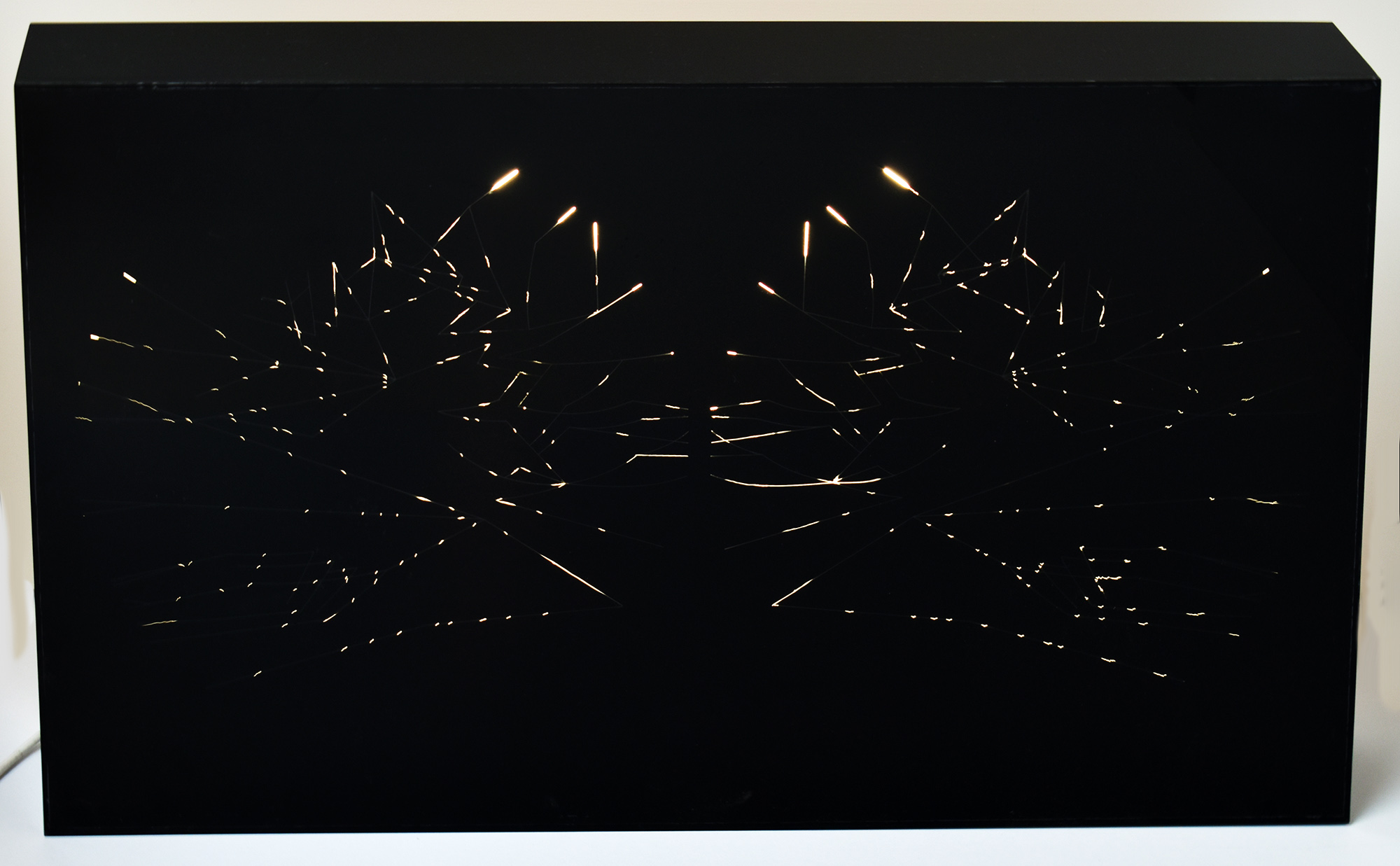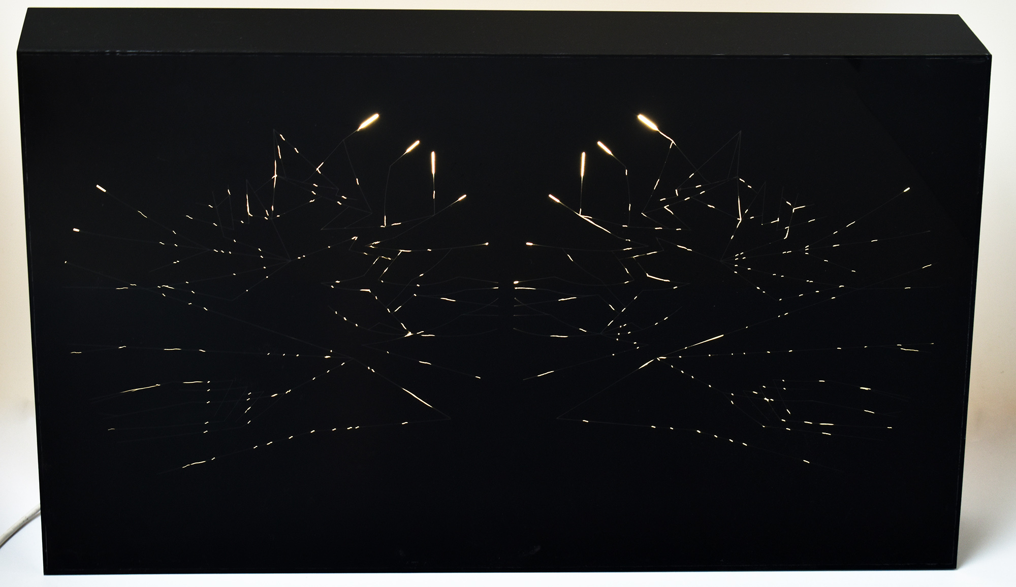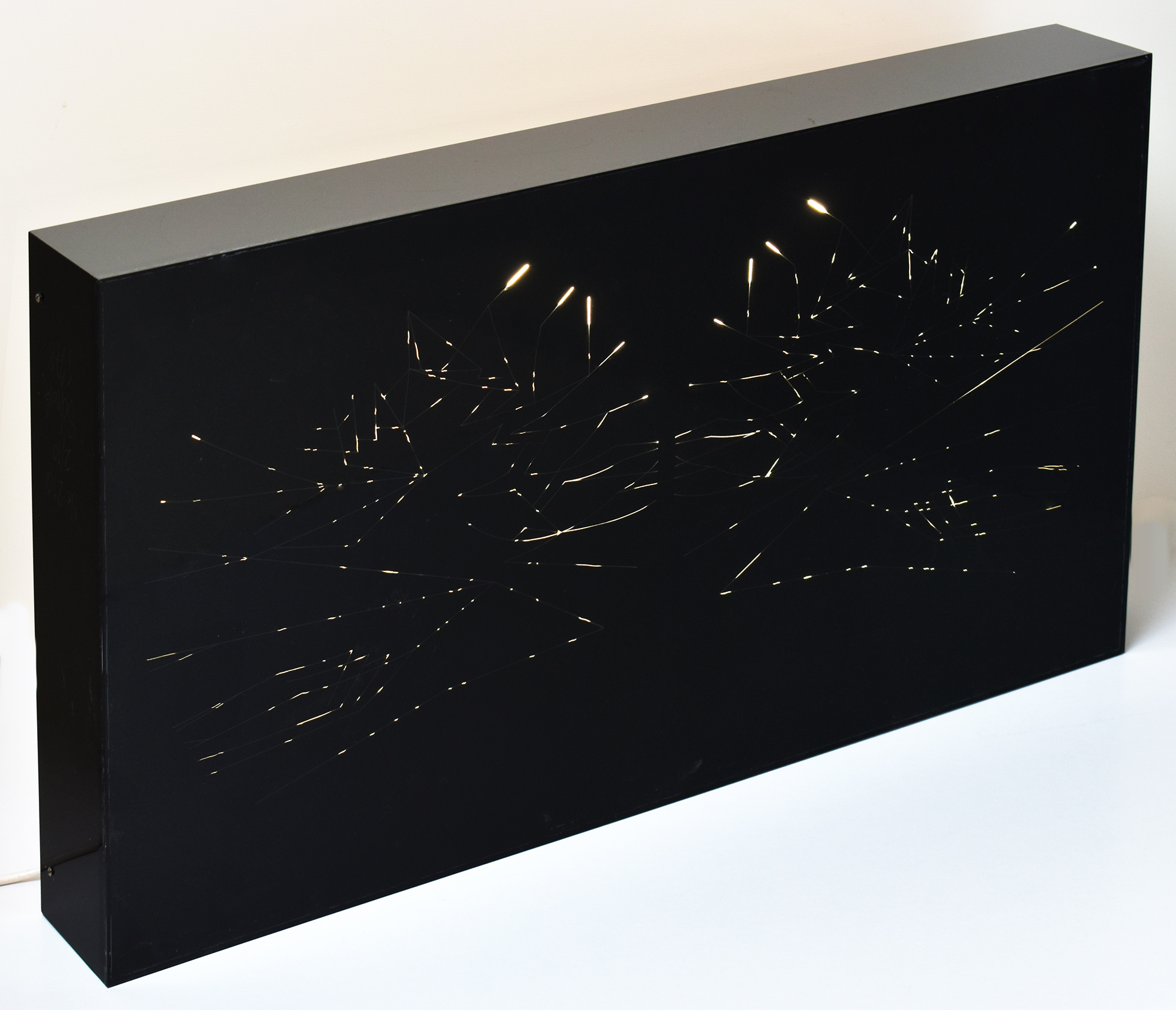 Schwarze lichtkinetische Box aus Acrylglas, auf deren Oberfläche verschieden große Lichtpunkte erscheinen, die sich innerhalb eines grafischen Musters unregelmäßig bewegen und wieder verschwinden. Die verschraubte, verschlossene Box selbst enthält eine rotierende Achse und eine Leuchtstoffröhre. An einem weißen Stromkabel (3 Meter lang), ausgehend von der hölzernen Rückseite der Box, befindet sich der Kippschalter. Rückseite mit 2 kleinen Haken zur Aufhängung. Box an den schmalen Kanten (Stehfläche) etwas kratzspurig. Insgesamt sehr guter Zustand.