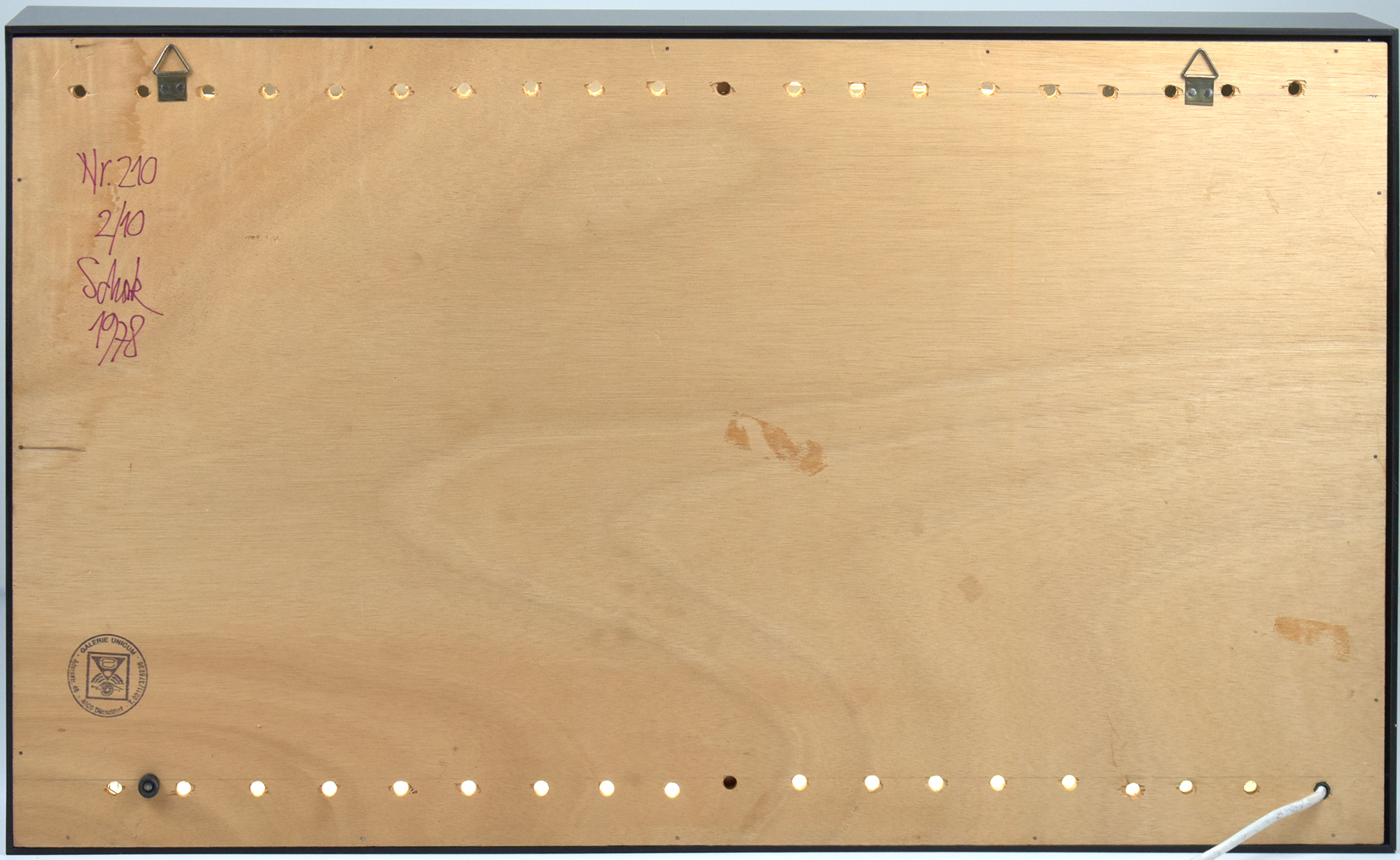 Nummer 2 von 10 Exemplaren des Objekts Nr. 210, rückseitig von Hans Schork signiert, nummeriert und datiert (1978), dort mit Stempel der Galerie Unicum, Düsseldorf. Zusätzlich in einer schmalen Kante der Box erneut durch Einritzung signiert, nummeriert und datiert.