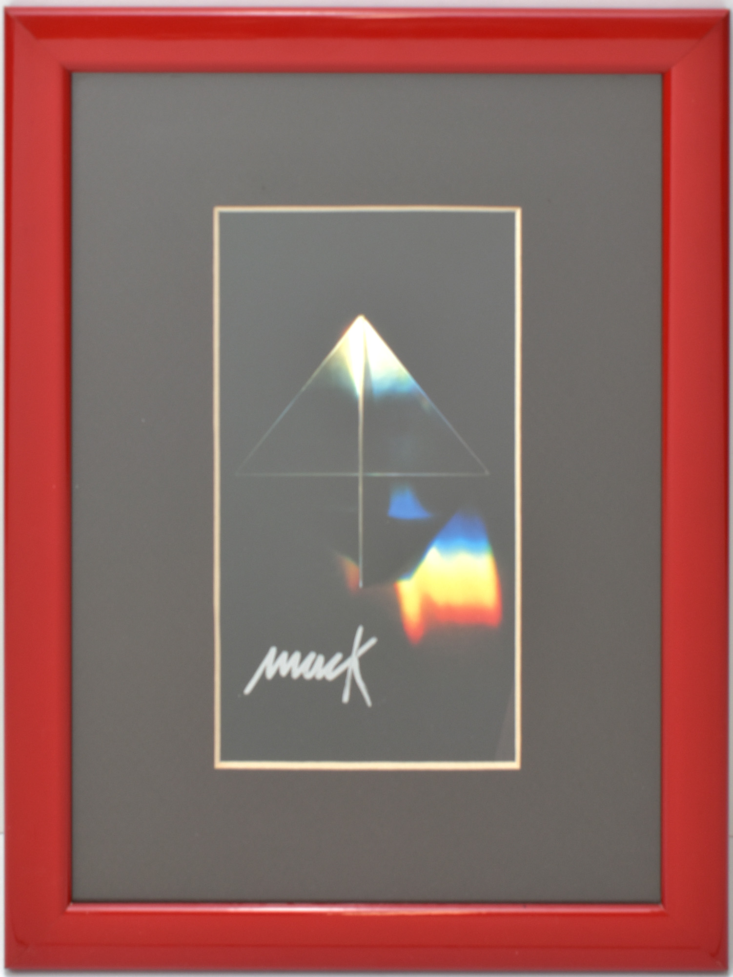Original exhibition invitation from the Kunstmuseum Ahlen, frontside with a picture of a work by Heinz Mack, signed by Heinz Mack with a silverish permanent marker. Framed behind glass/passepartout in a red wooden frame, not examined out of frame. Size invitation/passepartout window: 19.3 x 10.0 cm. Frame dimensions: 34.0 x 24.5 cm. Provenance: From the collection of a former employeer at Kunsthalle Düsseldorf. Fine condition.