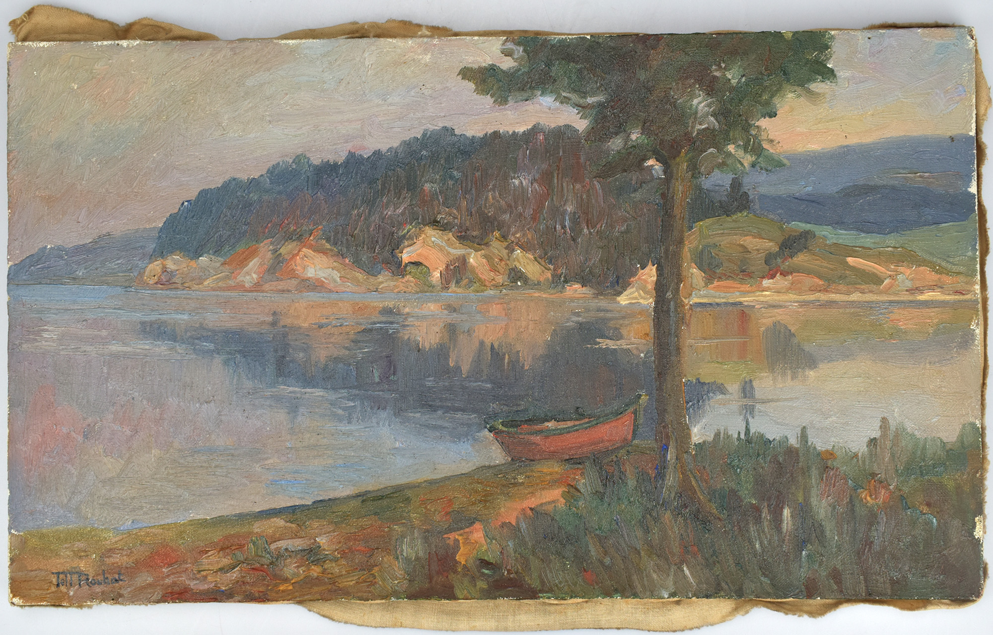 Oil painting on canvas, signed by Tell Rochat in the left lower corner in black. Provenance: From the estate of the art collector and author Ralf Seilheimer, with his inventory number on the backside. Dimensions painting/canvas: 27.3 x 46.3 cm. Cloth foxy on the backside, a but rusty around the attaching nails. Nearly fine condition.