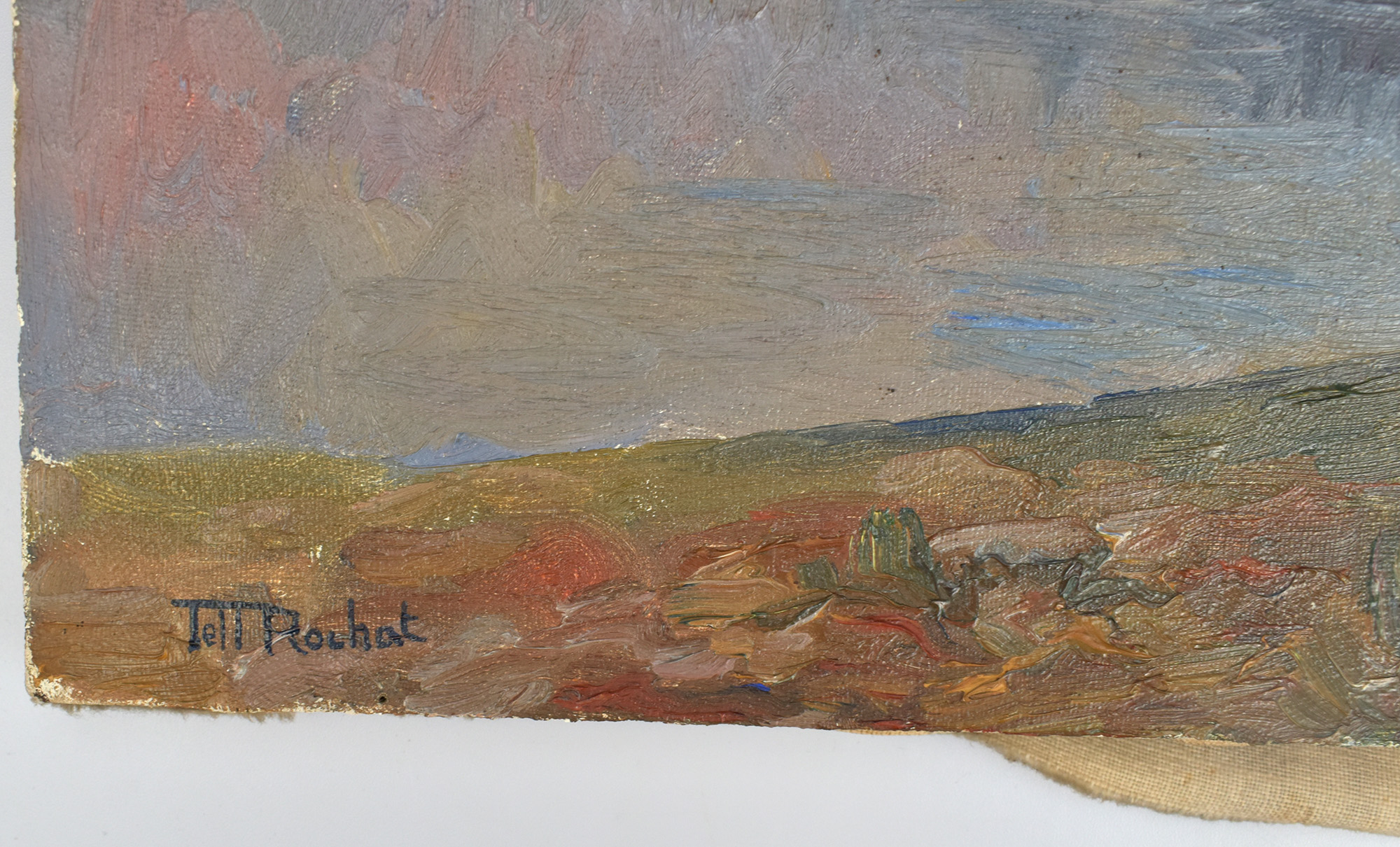 Ölgemälde auf Leinwand, von Tell Rochat links unten in Schwarz signiert. Maße Abbildung/Leinwand: 27,3 x 46,3 cm. Provenienz: Aus der Sammlung des Kunstsammlers und Autors Ralf Seilheimer, mit seiner Inventarnummer auf dem Keilrahmen. Leinwandstoff rückseitig stockfleckig, um die Montagenägel herum etwas rostspurig. Guter bis sehr guter Zustand.