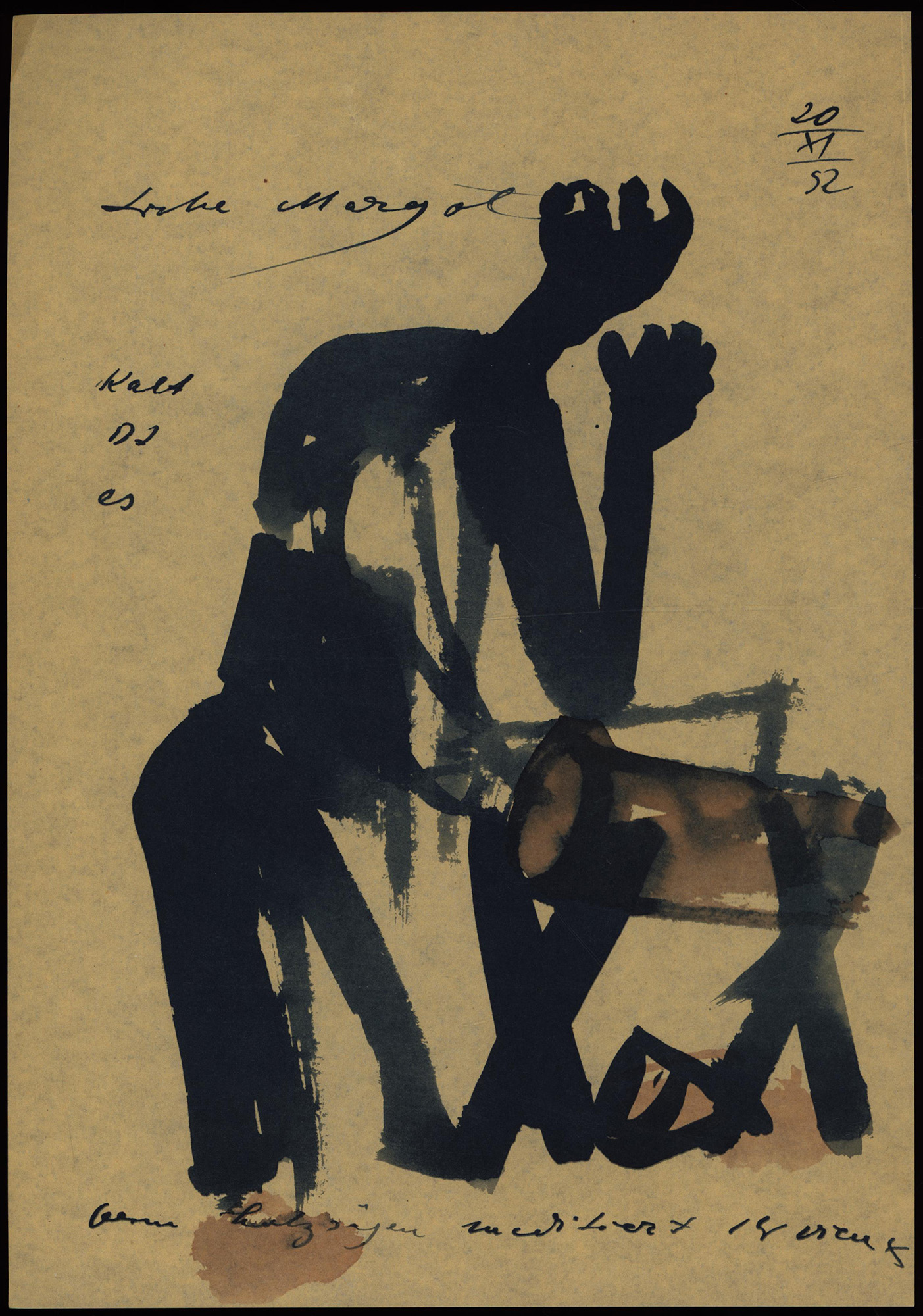 Braune Faltmappe aus Papier mit einem faksimiliertem Korrekturbogen von HAP Grieshaber, rückseitig mit 2-farbigem Holzschnitt, Maße: 29,5 x 41,5 cm, mittig gefaltet und am Blattrand etwas knickspurig, ein kleiner Randeinriss (ca. 2 cm). Firmenschrift der Werbeagentur Brose und Partner zu Weihnachten 1966, hierzu in der Mappe gedruckter Text. Beiliegend ein Faltbogen mit dem Titelaufdruck „hap grieshaber, briefe, 1-50 achalmdrucke, B“, hierin ein 4-seitiger faksimilierter Malbrief an Margot [Fürst] im DIN-A4-Format. Guter bis sehr guter Zustand.