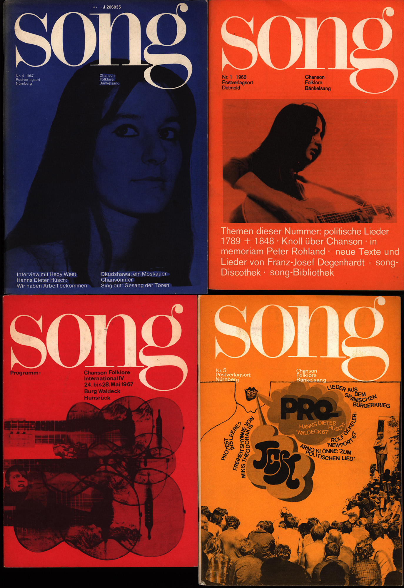 Song. Heft 1, 4 und 5 des Magazins und das Programmheft für Chanson Folklore International IV, 24. bis 28. Mai 1967, Burg Waldeck, Hunsrück. 4 Hefte. Erlangen, Verlag Song, 1966-1967. 8°. Magazin: 23 x 16 cm. Programmheft: 21,5 x 15,5 cm. 48; 63; 70; 56 Seiten. Klammergeheftete Original-Broschuren.