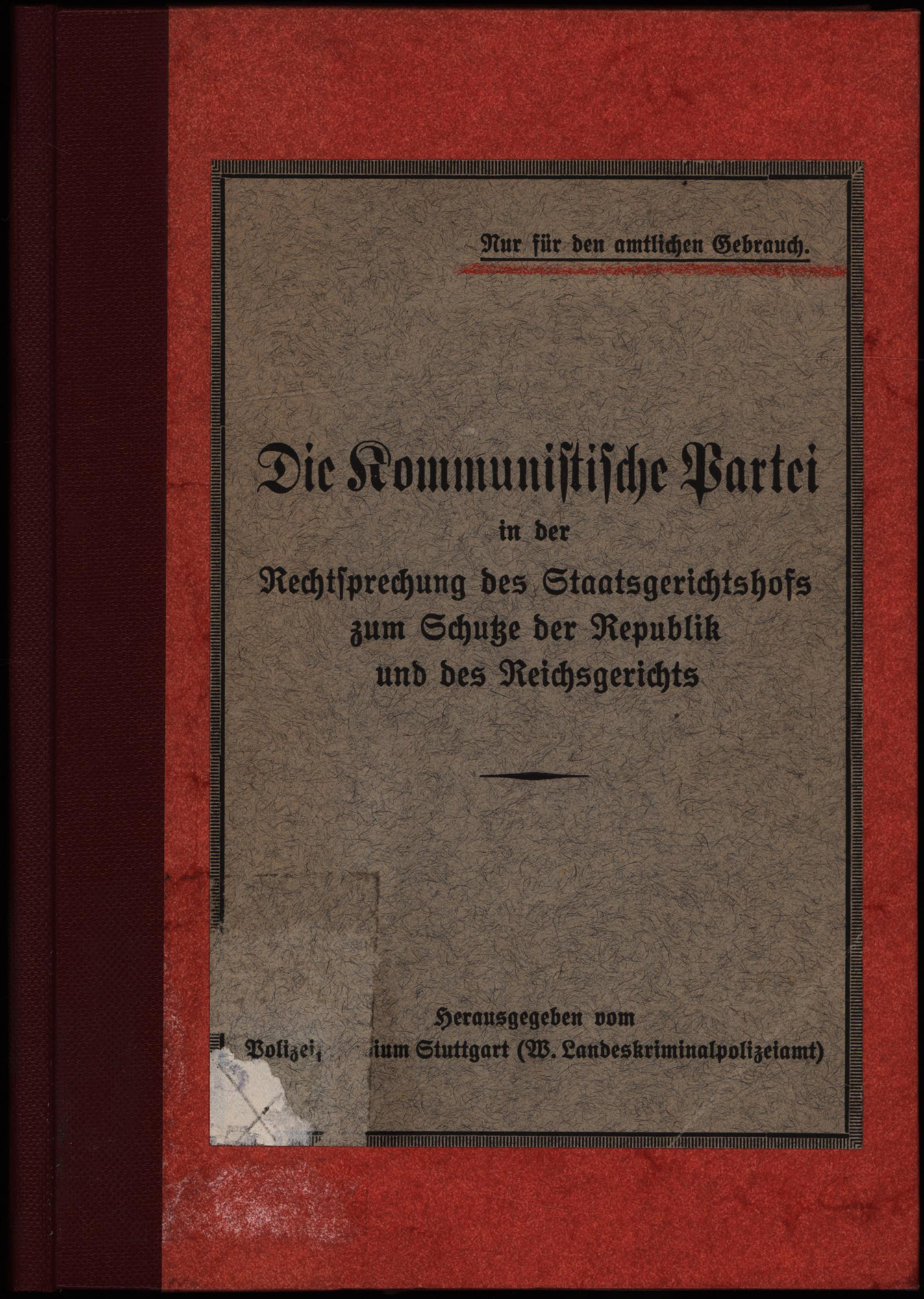 Die Kommunistische Partei in der Rechtsprechung des Staatsgerichtshofs zum Schutze der Republik und des Reichsgerichts. Stuttgart, Selbstverlag des Polizeipräsidiums Stuttgart, 1926. 8°. 21,5 x 15 cm. 344 Seiten. Bibliothekseinband mit Rückenbezug aus Buckram, marmoriertem Deckelbezug und aufkaschierter Original-Broschur auf dem Vorderdeckel.