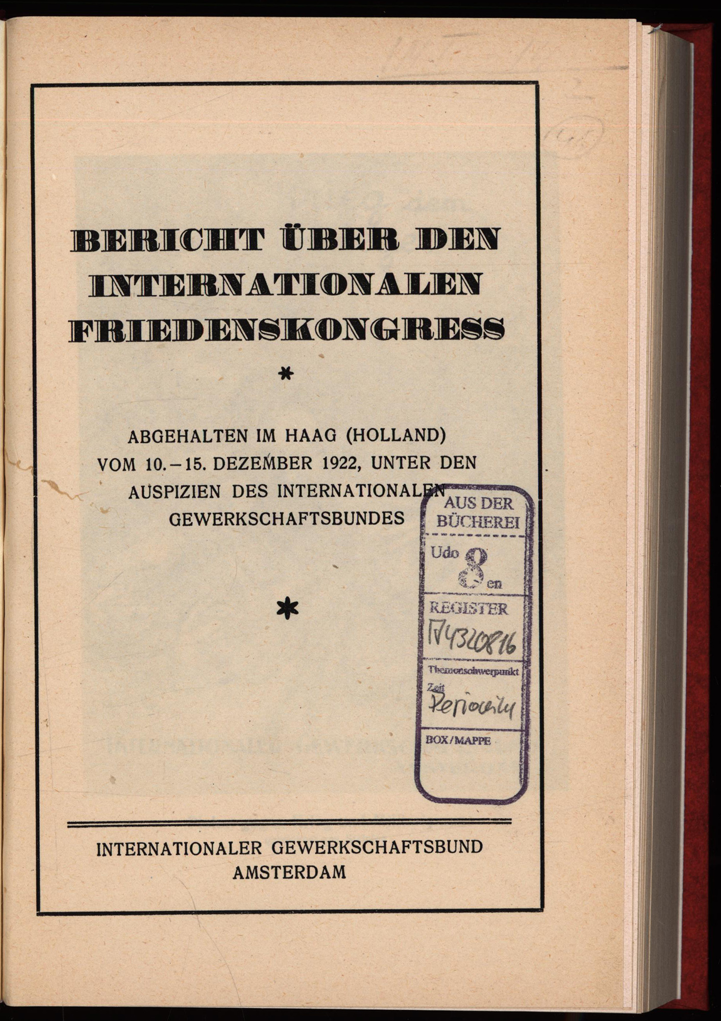 Bericht über den Internationalen Friedenskongress. Abgehalten im Haag (Holland) vom 10. – 15. Dezember 1922. Amsterdam, Verlag Internationaler Gewerkschaftsbund, 1923. 8°. 22,5 x 14,5 cm. 198 Seiten. Bibliothekseinband mit Rückenbezug aus Buckram und auf den Vorderdeckel kaschierter Original-Broschur.
