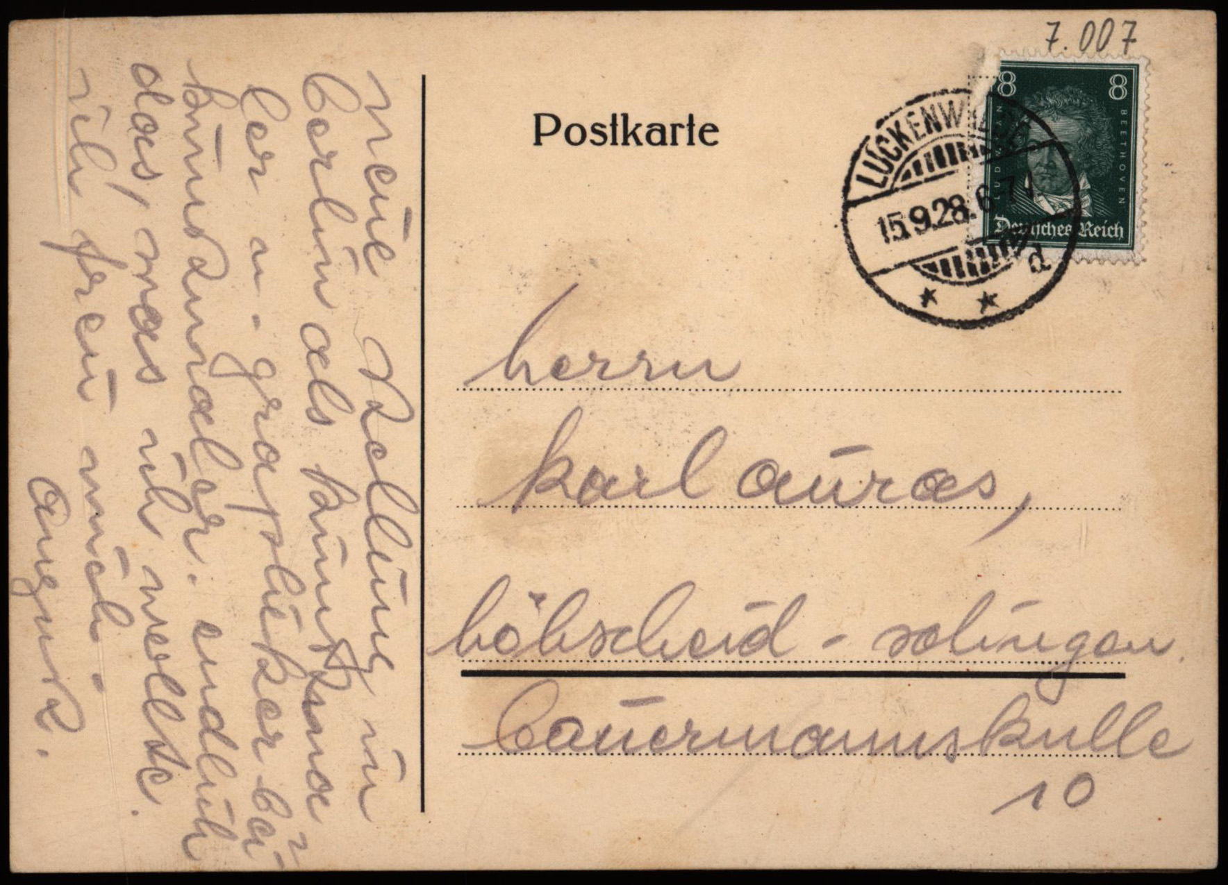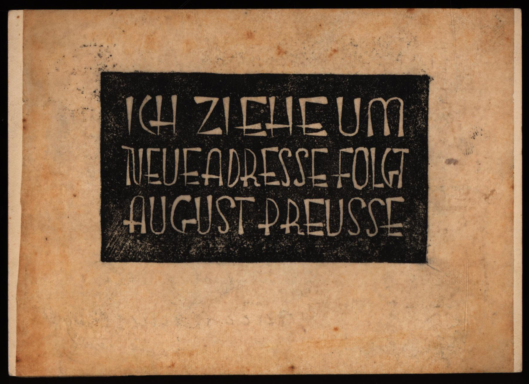 Original-Holzschnitt von August Preuße auf Papier. Nicht signiert, in der Druckplatte monogrammiert. WVZ 446. Maße Blatt: 11,4 x 8,5 cm. Maße Abbildung: 8,1 x 5,0 cm. Beiliegend eine Postkarte mit aufgezogenem Holzschnitt von August Preuße „ich ziehe um / neue adresse folgt / august preusse“, rückseitig mit signiertem 6-zeiligen handschriftlichen Brief von August Preuße an Karl Aurich, Solingen, betreffend seiner neuen Anstellung als Kunstmaler und Graphiker, Poststempel von 1928. Maße des Holzschnitts: 5,4 x 9,3 cm. Provenienz: Aus dem Nachlass des Kunstsammlers und Autors Ralf Seilheimer, beide Blätter mit seiner Nummerierung auf der Rückseite und beiliegendem Karteiblatt seiner Sammlung. Beide Holzschnitte etwas braunfleckig. Guter bis sehr guter Zustand.