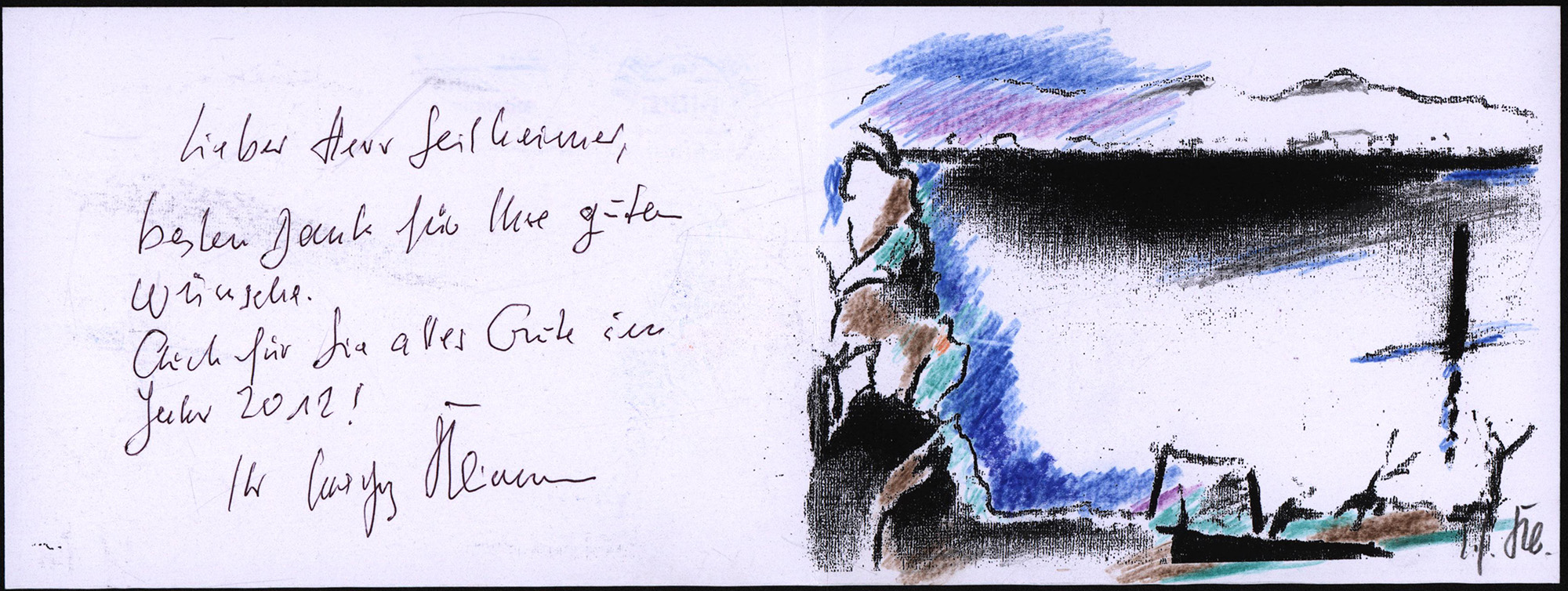 Original-Farbzeichnung auf weißem Faltblatt, Übermalung einer Fotokopie (?), in der unteren rechten Ecke mit Bleistift signiert, links nebenstehend von Carl-Heinz Kliemann mit schwarzem Kugelschreiber signiert und mit einem 4-zeiligen handschriftlichen Neujahrsgruß für 2012 an Ralf Seilheimer versehen. Maße Blatt (gesamt): 10,3 x 29,7 cm. Maße Abbildung: 10,3 x 14,0 cm. Provenienz: Aus dem Nachlass des Kunstsammlers und Autors Ralf Seilheimer, mit seiner Inventarnummer auf der Rückseite und beiliegendem Karteiblatt seiner Sammlung. Sehr guter Zustand.