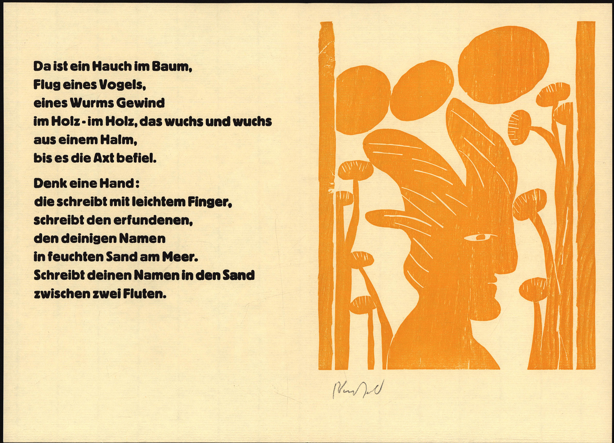 Neufeld, Wilhelm: Da ist ein Hauch im Baum… Einblattdruck. 1993. [Signierter Original-Holzschnitt]. (Wilhelm Neufeld, geb. 02.12.1908 in Traunstein, gest. 21.11.1995 in Chieming, deutscher Grafiker, Typograf, Buchkünstler, Pressendrucker, Maler und Bildhauer).
