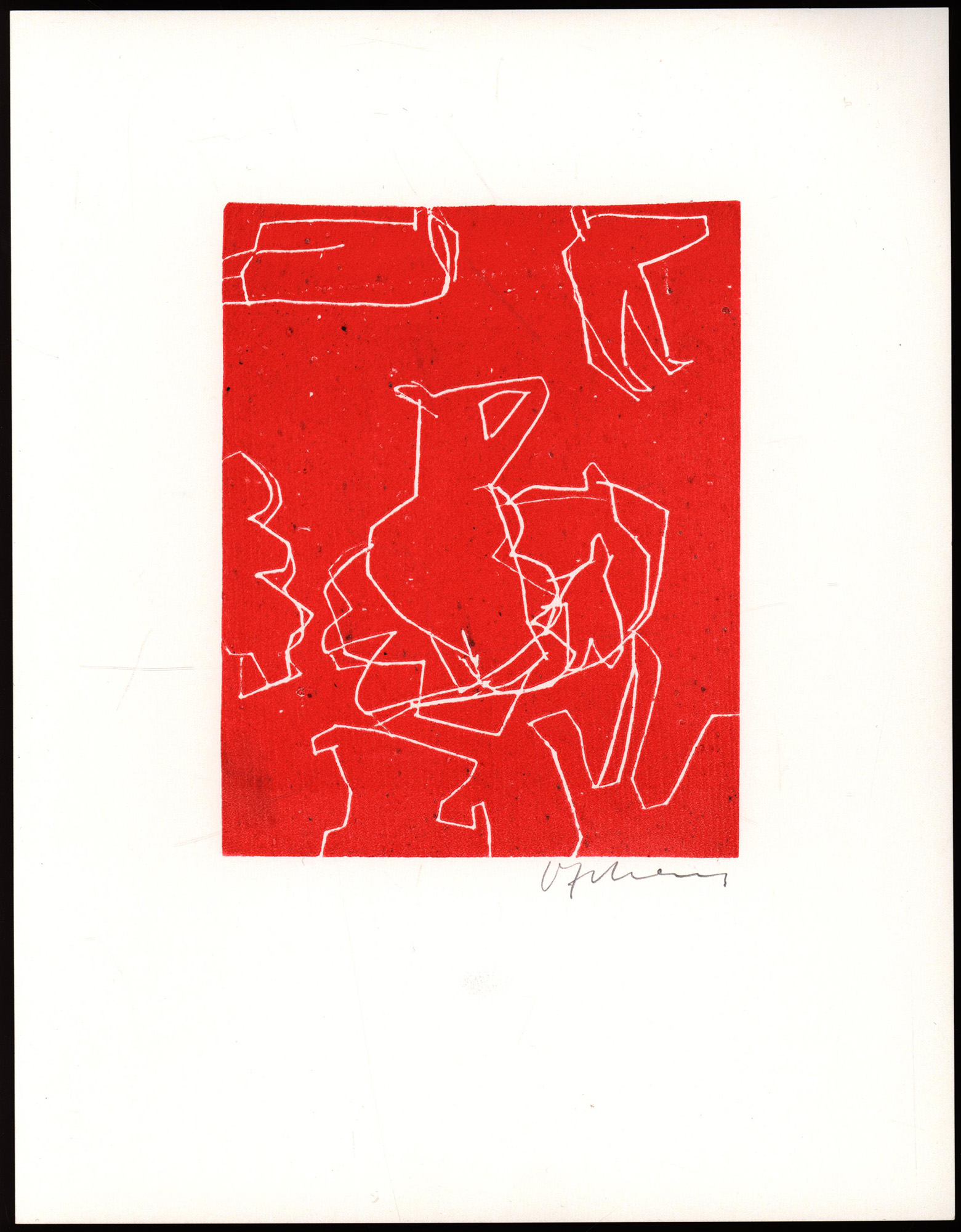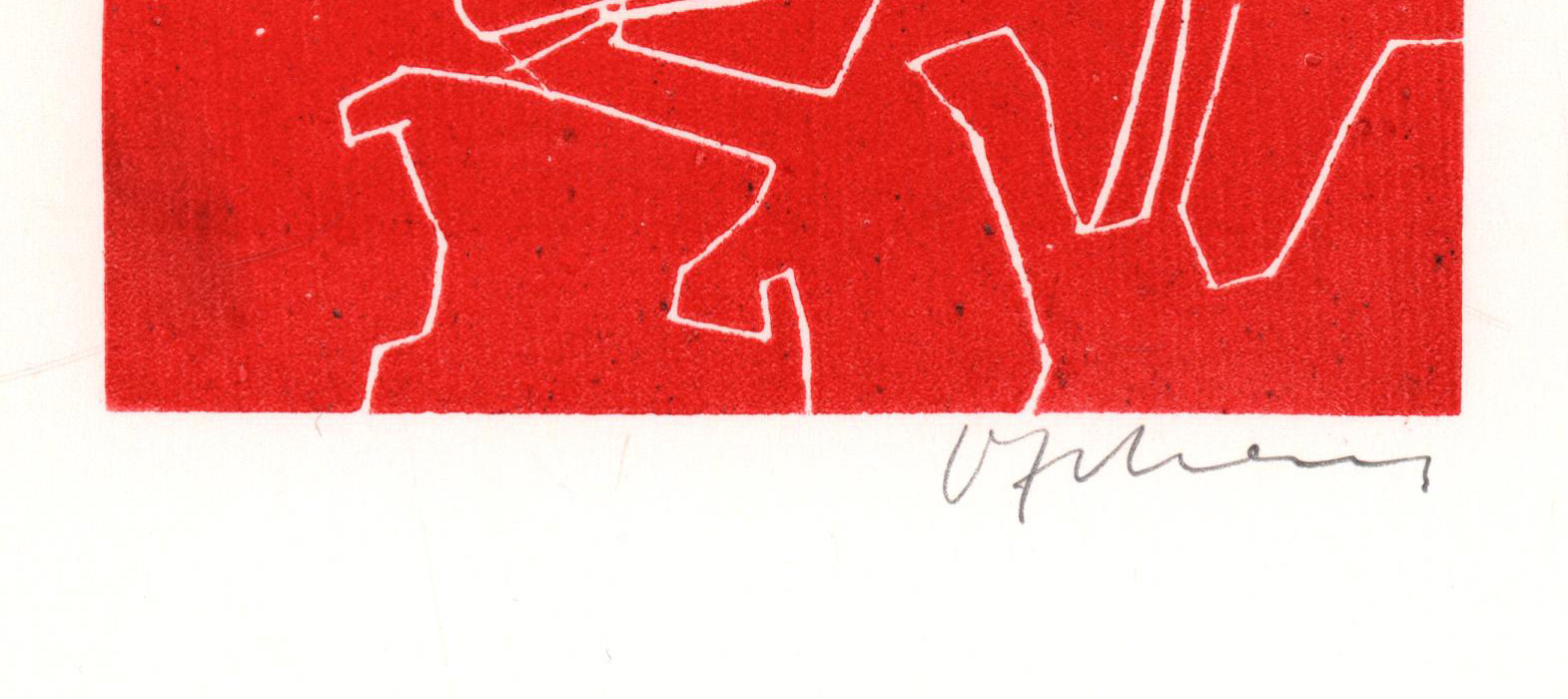 Original-Grafik von Volker Lehnert in Rot, unterhalb der Abbildung mit Bleistift signiert. Blattgröße: 27,0 x 21,0 cm. Abbildungsgröße: 14,5 x 11,6 cm. Provenienz: Aus dem Nachlass des Kunstsammlers und Autors Ralf Seilheimer, mit seiner Inventarnummer auf der Rückseite und beiliegendem Karteiblatt seiner Sammlung. Sehr guter Zustand.
