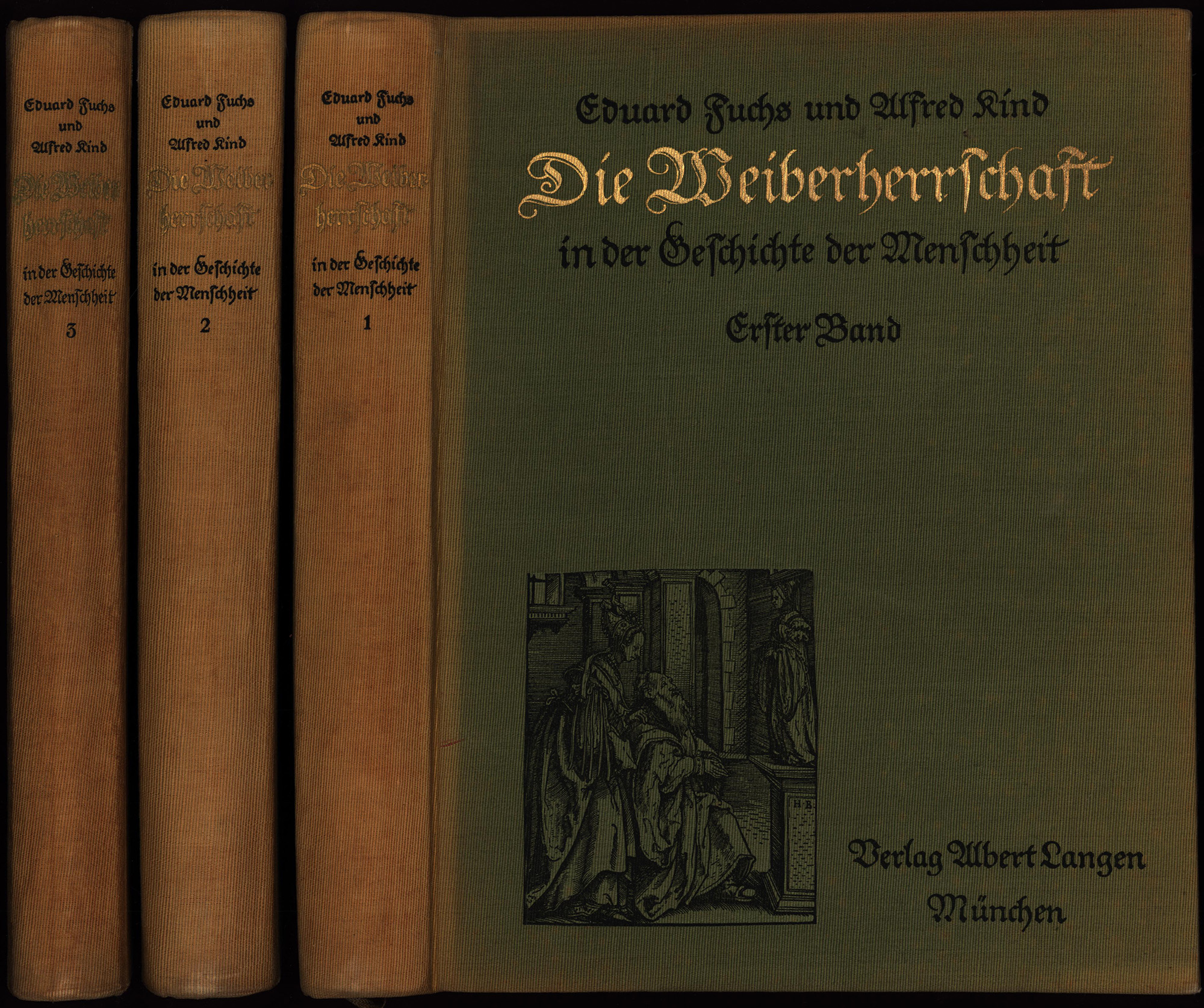 Fuchs, Eduard und Kind, Alfred: Die Weiberherrschaft in der Geschichte der Menschheit. Mit 665 Textillustrationen und 90 Beilagen. Erster [bis] dritter Band. 3 Bände (2 Hauptbände und ein Ergänzungsband, komplett). München, Verlag Albert Langen, 1913-1914. 4°. 28 x 22 cm. X, 712; 319 Seiten. Original-Leinenbände mit schwar- und goldgeprägten Titeln, schwarzer Deckelabbildung, illustrierten Vorsätzen und Rundum-Grünschnitt.