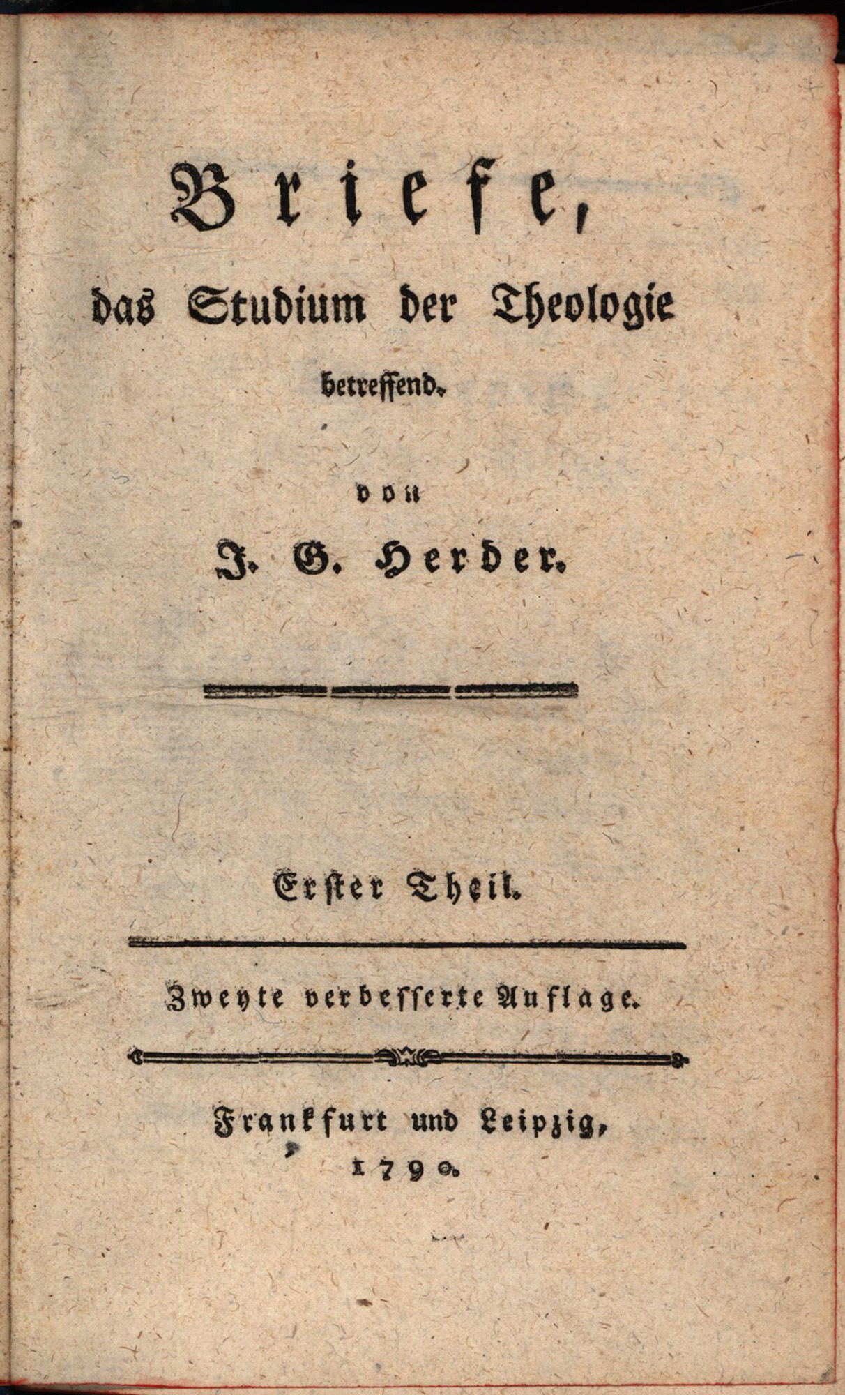 Herder, Johann Gottfried von: Briefe, das Studium der Theologie betreffend. 4 Teile (in 1 Band, komplett). Frankfurt und Leipzig, s.l., 1790. Klein-8°. 18,5 x 11 cm. [4] Blatt, 388 Seiten, [1] Blatt, 392 Seiten. Pappband der Zeit mit goldgeprägten Rückentiteln auf rotem und schwarzem Lederrückenschild und Rundum-Rotschnitt.