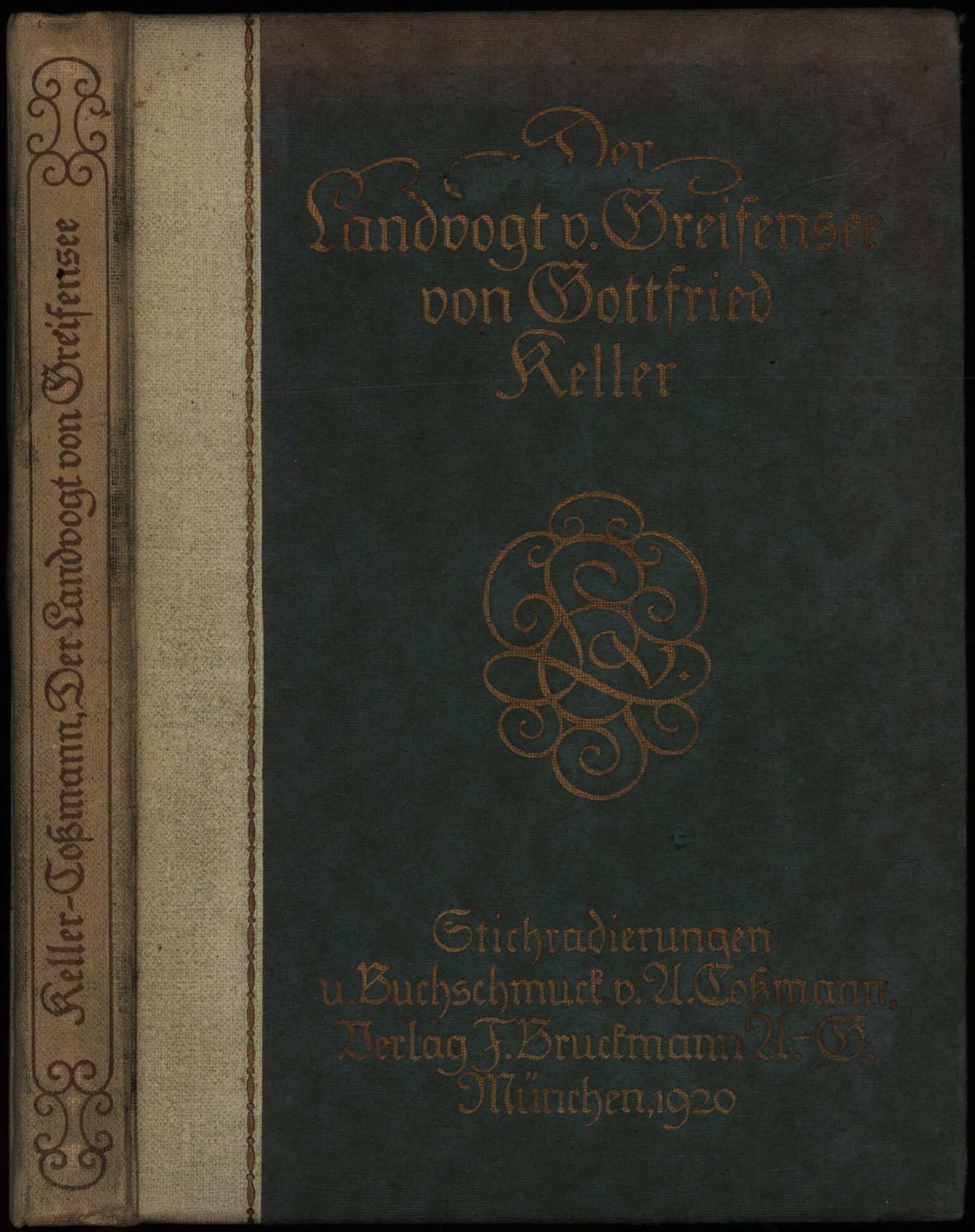 Keller, Gottfried: Der Landvogt von Greifensee. Stichradierungen u. Buchschmuck v. A. Coßmann. München, F. Bruckmann Verlag, 1920. 8°. 18,5 x 13 cm. Original-Leinenband mit goldgeprägtem Rücken- und Deckeltitel.