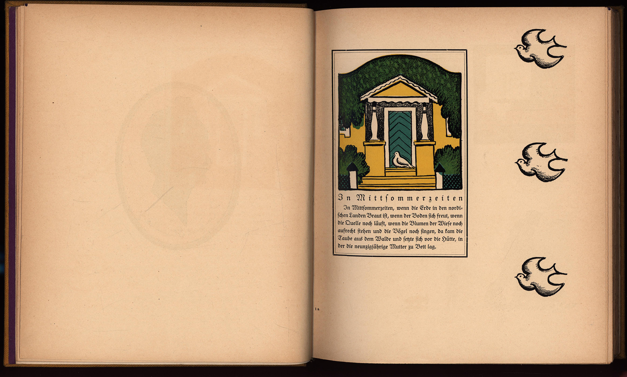 1. Auflage. Seebaß II 1994. Jede Seite mit einer oder mehreren Farbabbildungen von Thorsten Schonberg. „Abgesehen von seinem hohen literarischen Wert, eines der schönsten deutschen Bücher aus der Zeit des Jugendstils von origineller, hervorragender Ausstattung. Die Texte sind in Oktavgröße gedruckt … und von … Abbildungen umgeben. Nur teilweise als Kinderbuch anzusprechen“. (ibidem). Rücken aufgehellt. Vorsatzpapier im vorderen Innengelenk eingerissen. Seiten minimal gebräunt. Gutes bis sehr gutes Exemplar.