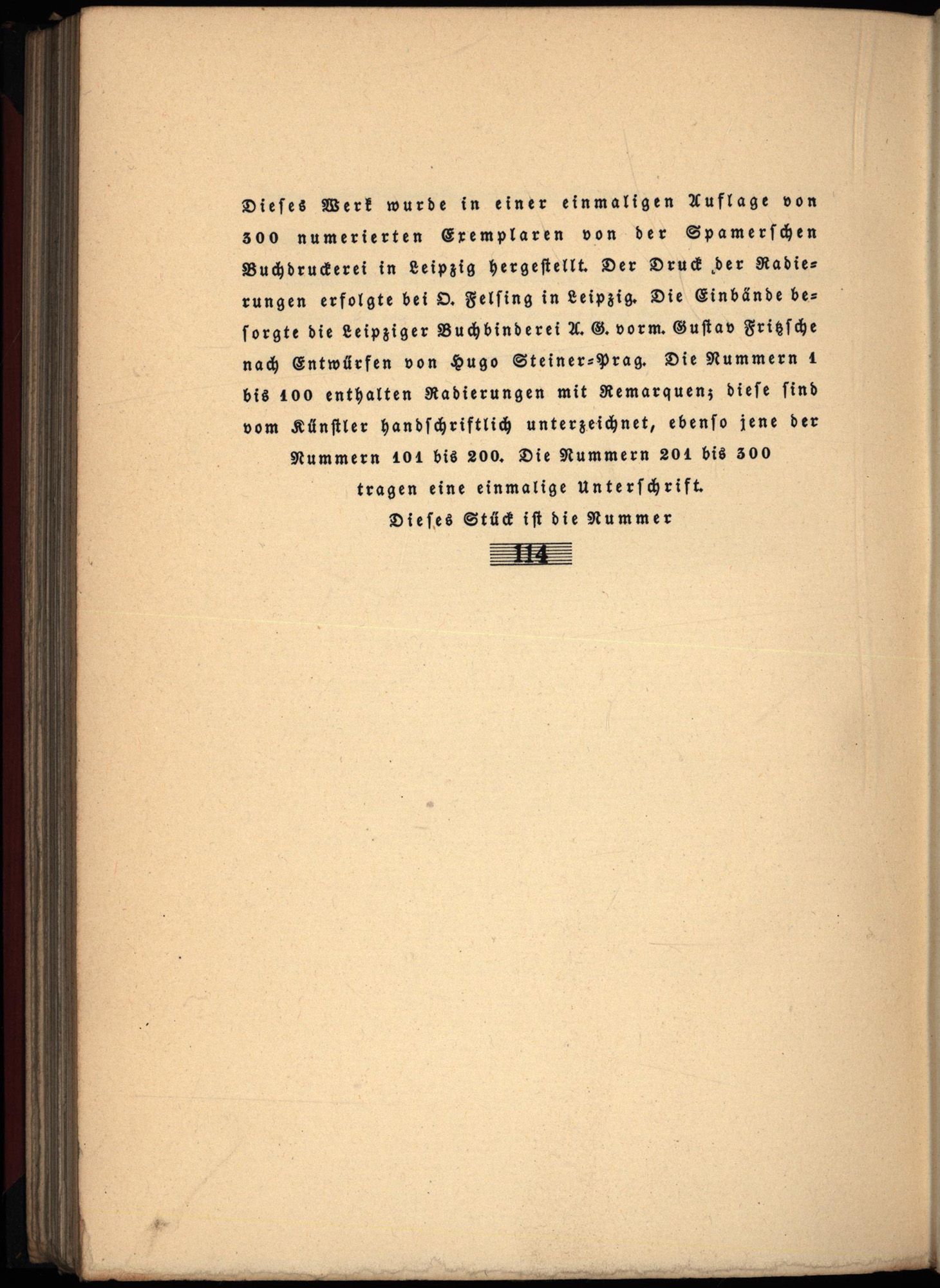 Nummer 114 von 300 nummerierten Exemplaren. Frontispiz und 11 weitere Original-Radierungen auf Tafeln, jede davon von Hugo Steiner-Prag in Blei signiert. Einband leicht berieben und etwas lichtrandig. Radierungen mit Abklatsch auf der gegenüberliegenden Seite. Gutes bis sehr gutes Exemplar.