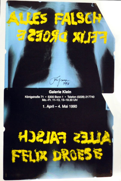 Plakat zur Ausstellung: „Alles Falsch. Felix Droese. Galerie Klein. Königsstraße 71. 5300 Bonn. 1. April-4. Mai 1990. Offsetdruck auf Papier. Von Felix Droese signiert und datiert. Maße Blatt: 70,0 x 50,0 cm. Maße Abbildung: 68,0 x 43,0 cm. Sehr gutes Exemplar.