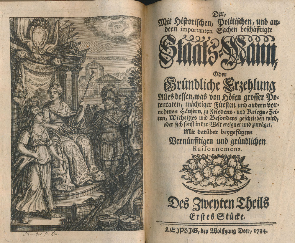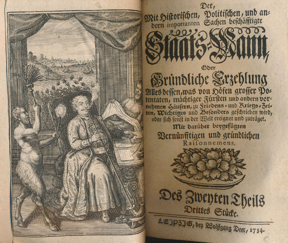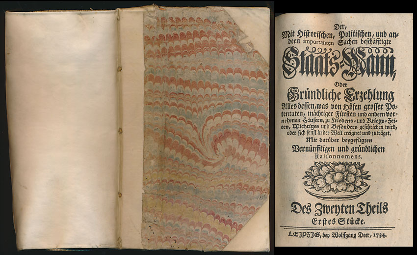Der, Mit Historischen, Politischen, und andern importanten Sachen beschäfftigte Staats-Mann, Oder Gründliche Erzehlung Alles dessen, was von Höfen grosser Potentaten, mächtiger Fürsten und andern vornehmen Häusern, zu Friedens- und Kriegs-Zeiten, Wichtiges und Besonders geschrieben wird, oder sich sonst in der Welt ereignet und zuträget. Mit darüber beygefügten Vernünfftigen und gründlichen Raisonnements. Des Zweyten Theils Erstes (bis Sechstes) Stück. 6 Teile (in 1 Band, komplett). Leipzig, Bey Wolfgang Deer, 1734. Klein-8°. 17,5 cm. 222 Seiten, Seiten 226-460, Seiten 464-713, Seiten 718-960, Seiten 964-1216, Seiten 1220-1469. 16 Seiten Register. Halbpergamentband der Zeit über Holzdeckeln mit 5 durchgezogenen Pergamentbändern. Handschriftlicher Rückentitel.