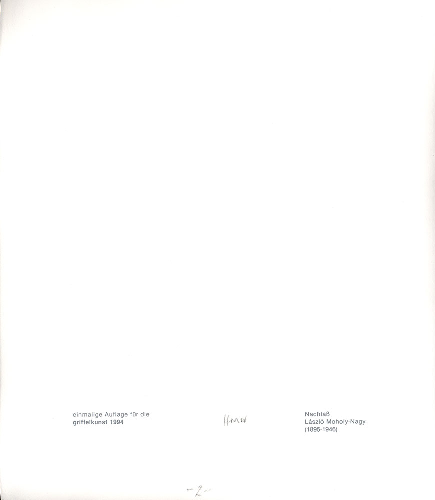 Original-Fotografie in Schwarz-Weiß aus dem Nachlass. Silbergelatineabzug auf Ilford FB-Papier, hergestellt durch Atelier Margotow, Wahlershausen. Edition der Griffelkunst Hamburg, 1994. Griffelkunst, Verzeichnis der Editionen 274 B 3. Rückseitig von Hattula Moholy-Nagy monogrammiert und mit typografischer Beschriftung versehen. Maße Blatt: 40,0 x 30,0 cm. Maße Abbildung: 29,0 x 20,0 cm. Sehr gutes, tadelloses Exemplar.