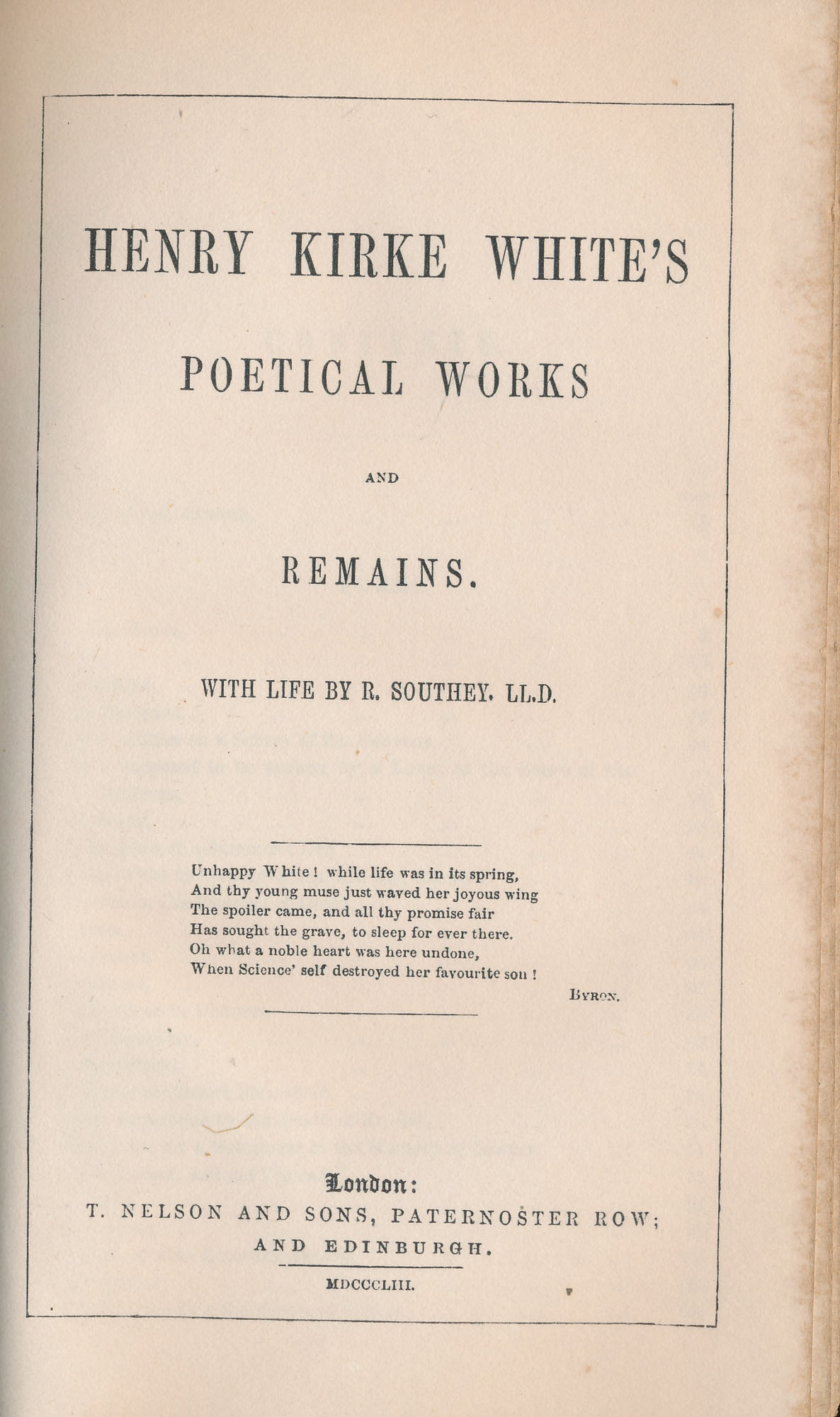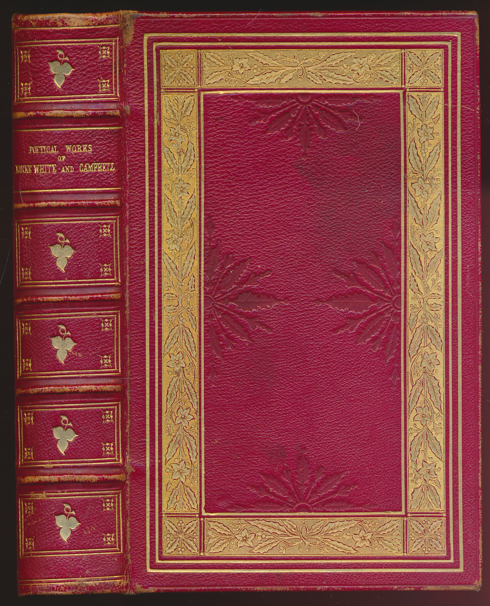 White, Henry Kirke – Campbell, Thomas: Poetical Works of Kirke White and Campbell. (2 Volumes in 1) Volume 1: Henry Kirke White’s Poetical Works and Remains. With Life by R, Southey. Volume 2: The Pleasures of Hope, Gertrude of Wyoming, and other Poems by Thomas Campbell. London, T. Nelson and Sons, Pasternoster Row and Edinburgh, 1853. Klein-8. 17 cm. XLVII, 340 und XXXV, 112 Seiten. Signierter Handeinband (David Ryce, 129 Buchanan Street): Roter Ganzlederband mit goldgeprägtem Rückentitel, Vorder- und Rückendeckel, sowie Kanten und Innenkanten mit gold und blindgeprägtem floralem/ornamentalem Buchschmuck. Rundum-Goldschnitt.