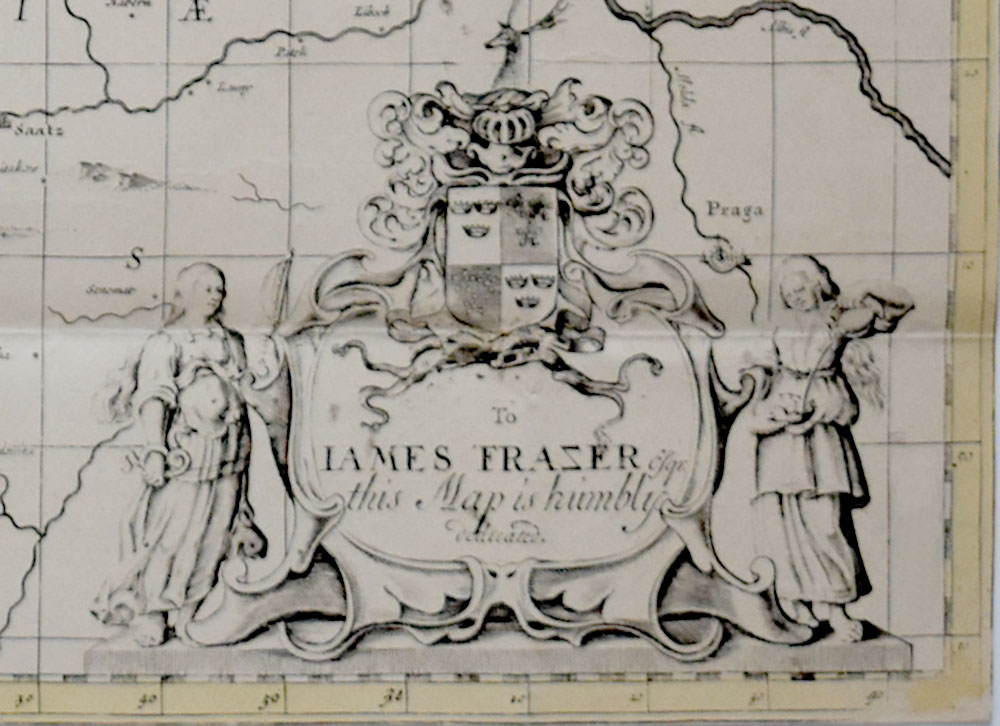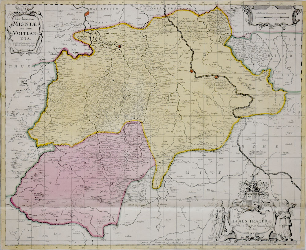 Border and surface colored original copper engraving published by Peter Schenk the Elder and Gerard Valck in Amsterdam around 1700. Top left title cartridge, mileage pointer, bottom right dedication cartridge: „To James Frazer this map is humbly dedicated“. With the cities: Halle, Dresden, Leipzig, Meissen. Dimensions sheet / illustration: 42.0 x 51.5 cm. The copperplate engraving was folded twice, the fold is slightly visible, on the left edge reinforced with a paper strip on the back (former mounting). Very good copy in strong coloring.