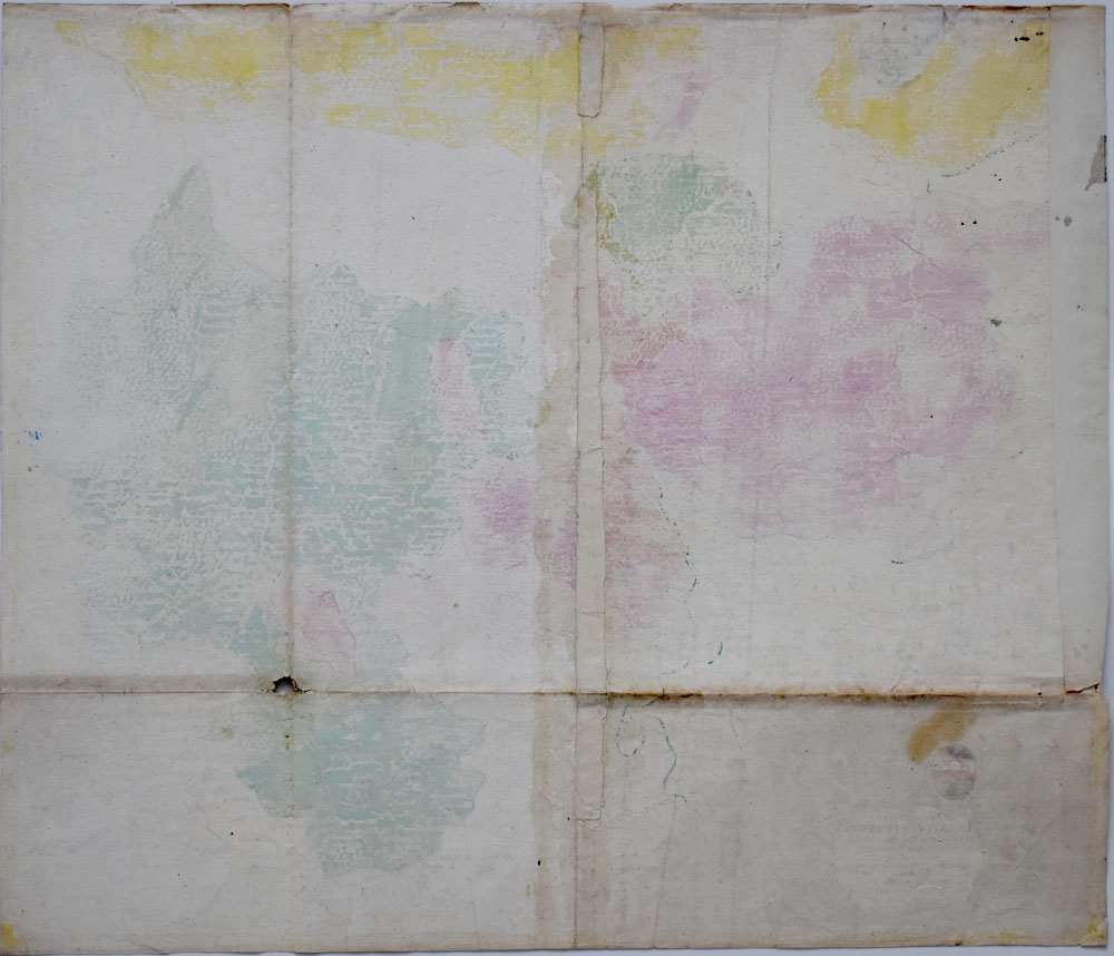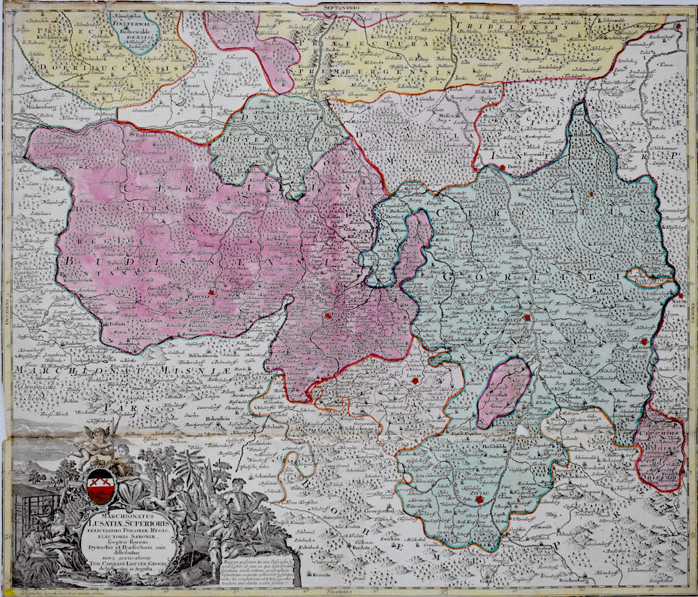 Grenz- und Flächenkolorierter Original-Kupferstich um 1750 von Tobias Conrad Lotter, Augsburg, zeigt die Oberlausitz mit den Kreisen Bautzen, Görlitz und dem angrenzenden Gebiet, mit den Städten Radeberg, Camentz (Kamenz), Budissin (Bautzen), Görlitz, Löbau, Zittau, Naumburg. Unten links mit großer figürlicher Titelkartusche. Maße Platte/Blatt: 49,0 x 57,5 cm. Kupferstich war zweifach gefaltet, Faltung teils schwach sichtbar, kleines Loch (ca. 1 x 1cm) am linken Rand rückseitig mit einem Papierstreifen verstärkt (ehemalige Montage). Gutes Exemplar in kräftigem Kolorit.