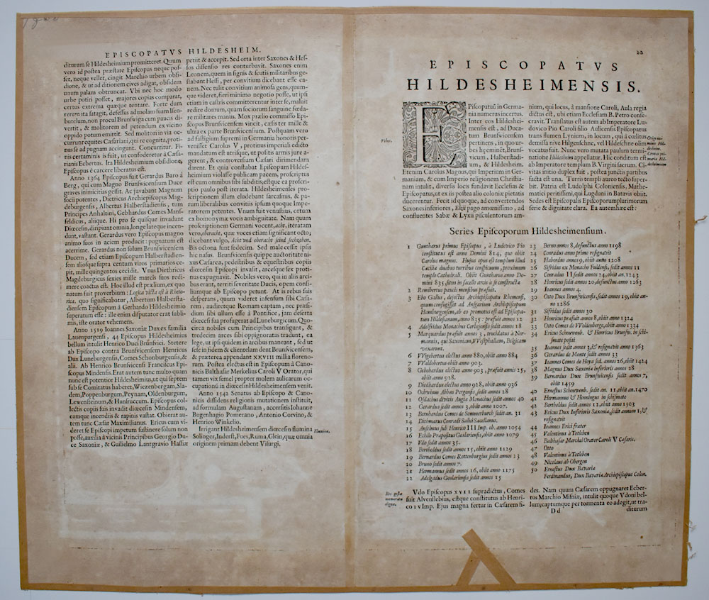 Altkolorierter Original-Kupferstich von 1645 von Johannes Michael Gigas, aus dem „Theatrum Orbis Terrarum, sive Atlas Novus“ von Willem und Johann Bleau. Rechts unten mit ausgemalter figurativer Kartusche, links oben großes koloriertes Wappen von Hildesheim, Wälder, Flüsse, Städte und vor allem die kleinen Stadtwappen in altem Kolorit. Rückseitig Text in Latein. Maße Blatt: 48,5 x 55,5 cm. Maße Platte/Abbildung: 41,5 x 50,0 cm. Rückseitiger Randbereich mit Spuren ehemaliger Montage im Rahmen, mit Resten von Klebeband. Gutes bis sehr gutes Exemplar.