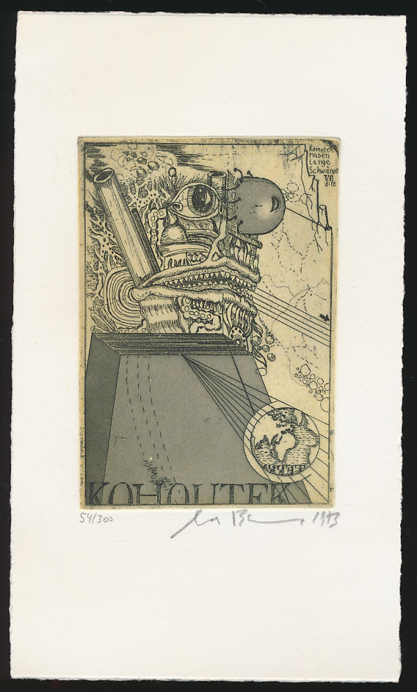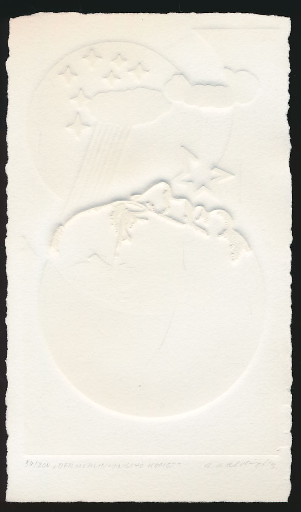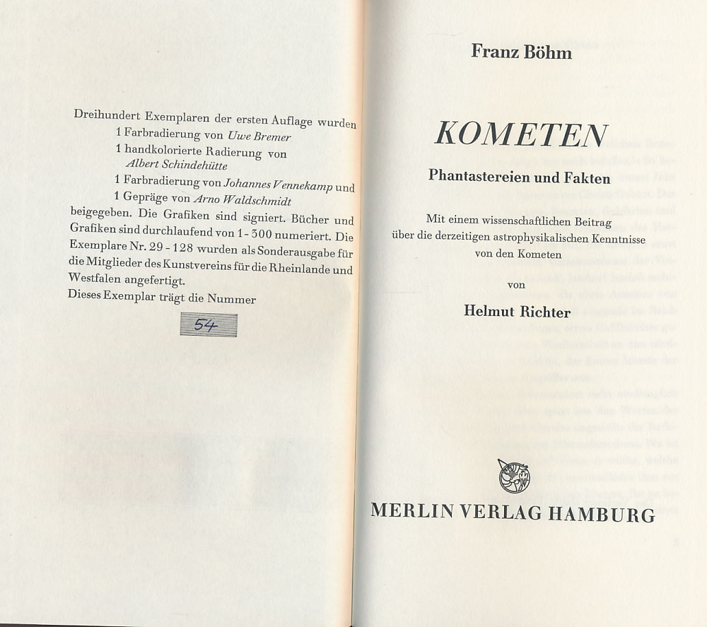 Number 54 of 100 (300 in total) numbered copies of the special edition (here one of the copies of numbers 29-128, which were printed for the members of the Kunstverein für die Rheinlande und Westfalen) with 4 original graphics attached. Uwe Bremer: „Kohoutek“ color etching. Albert Schindehütte: hand-colored etching „Sterntaler“. Johannes Vennekamp: Color etching „Comet“. Arno Waldschmidt: Embossed print „Der Merlinianische Komet“. Dimensions sheets: 20.5 x 12.0 cm. Original cloth binding with slipcase. Very good copy.
