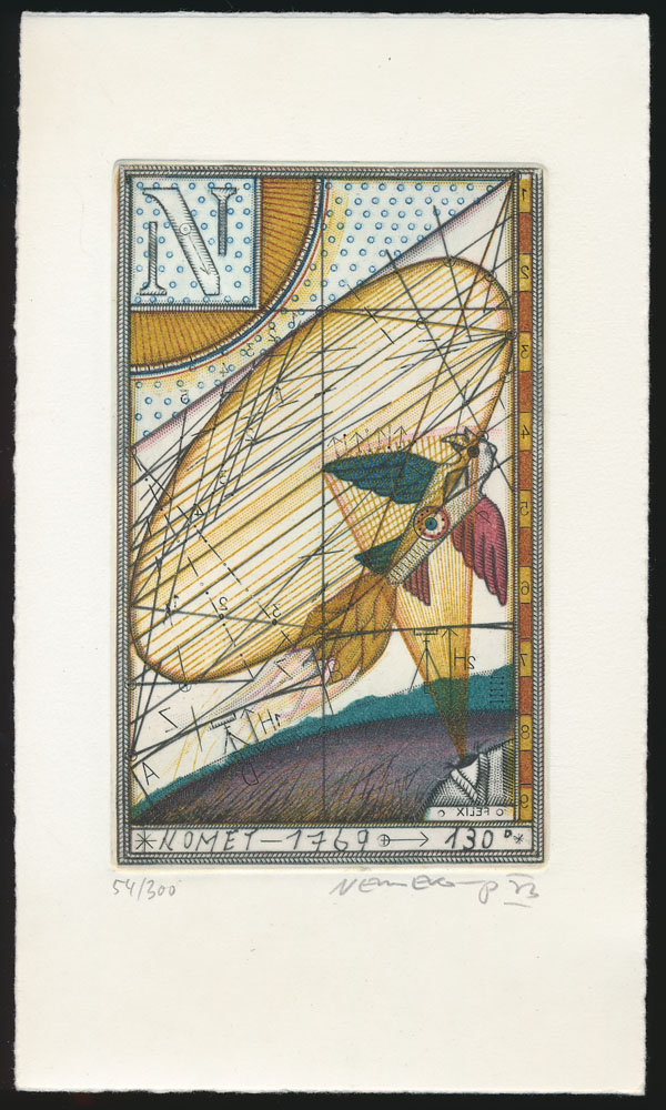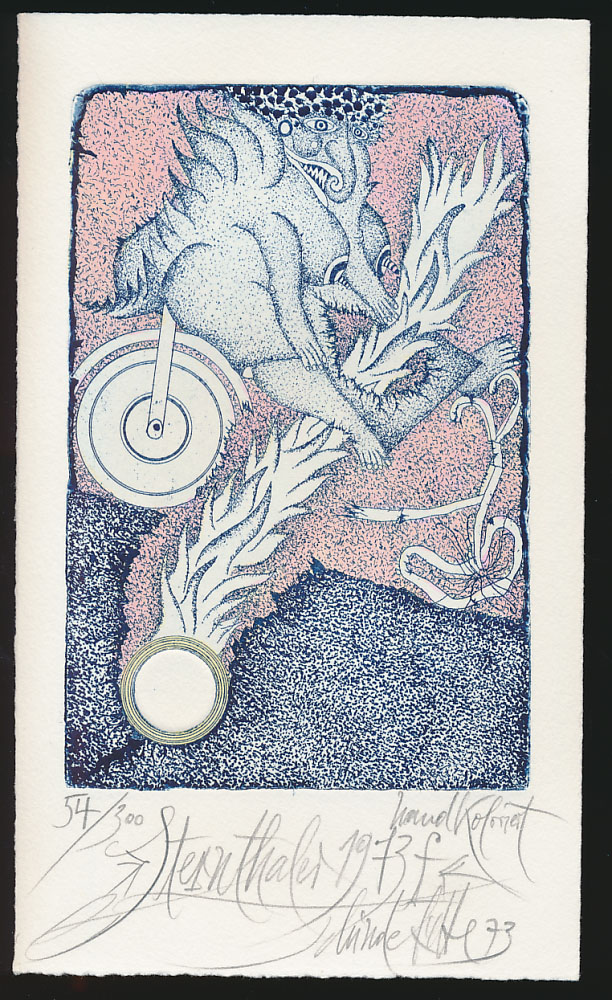 Nummer 54 von 100 (gesamt 300) nummerierten Exemplaren der Vorzugsausgabe (hier eins der Exemplare der Nummern Nr. 29-128, die für die Mitglieder des Kunstvereins für die Rheinlande und Westfalen gedruckt wurden) mit 4 beiliegenden Original-Grafiken. Uwe Bremer: Farbradierung „Kohoutek“. Albert Schindehütte: handkolorierte Radierung „Sterntaler“. Johannes Vennekamp: Farbradierung „Komet“. Arno Waldschmidt: Prägedruck „Der merlinianische Komet“. Maße Blätter: 20,5 x 12,0 cm. Sehr gutes Exemplar.
