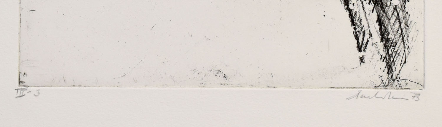 Original etching on handmade paper, signed, dated (73) and inscribed „III-3“ (3rd state, 3 copies) by Rolf Sackenheim below the illustration in lead. Dimensions picture / plate: 24.8 x 22.8 cm. Dimensions sheet: 44.7 x 34.0 cm. Provenance: From the collection of the Düsseldorf collector couple Ruth and Johannes Schreiber. Sheet on verso with collector’s stamp. Very good copy.