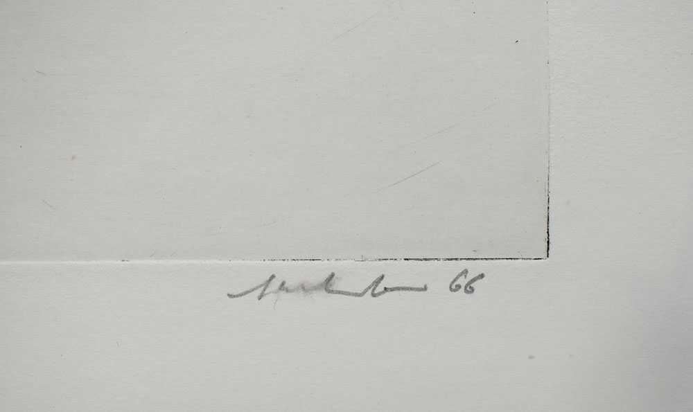 Original etching on handmade paper, signed, dated (66) and inscribed „I / 2“ (1st state, 2 copies) by Rolf Sackenheim below the illustration in lead. Dimensions picture / plate: 34.2 x 31.8 cm. Dimensions sheet: 38.0 x 54.0 cm. Provenance: From the collection of the Düsseldorf collector couple Ruth and Johannes Schreiber. Collector’s stamp on the reverse. Very good copy.