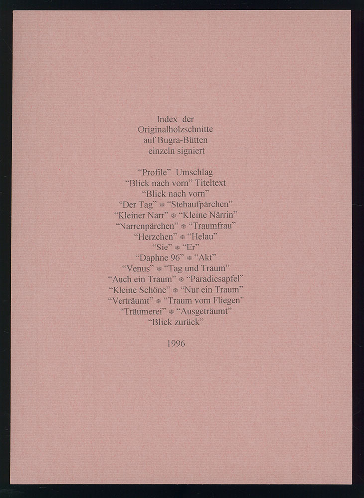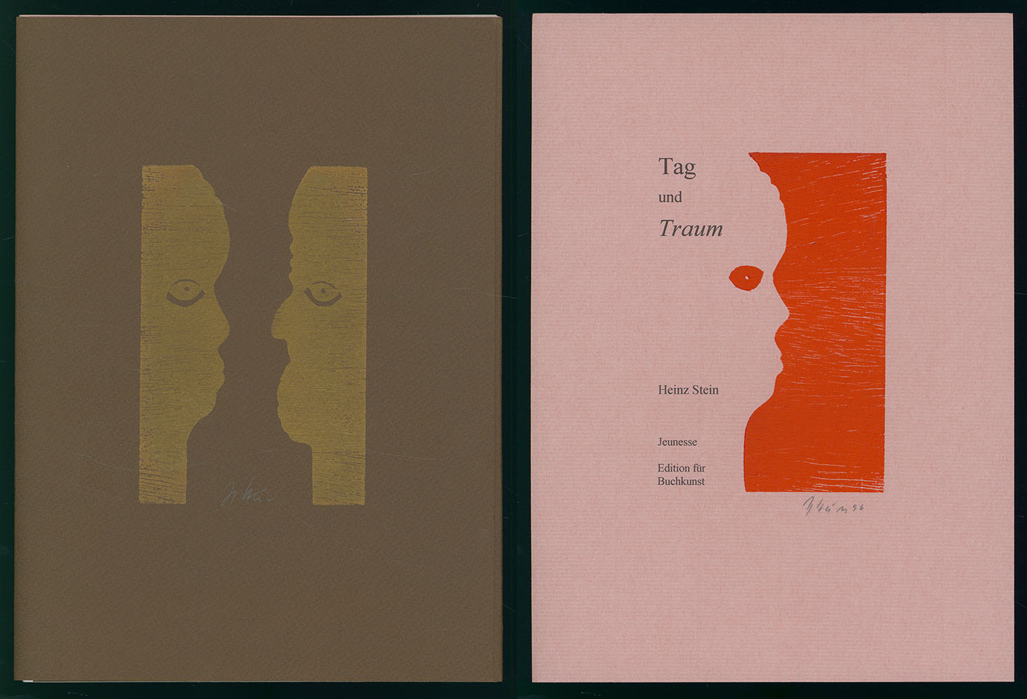 Eins von 37 Exemplaren, hier bezeichnet „Rezension“, auf Titelholzschnitt von Heinz Stein signiert, 24 lose, signierte und bezeichnete Original-Holzschnitte (Profile, Blick nach vorn, Der Tag, Stehaufpärchen, Kleiner Narr, Kleine Närrin, Narrenpärchen, Traumfrau, Herzchen, Helau, Sie, Er, Daphne 96, Akt, Venus, Tag und Traum, Paradiesapfel, Kleine Schöne, Nur ein Traum, Verträumt, Traum vom Fliegen, Träumerei, Ausgeträumt, Blick zurück) von Heinz Stein auf Bugra-Büttenpapier. Hier ohne den Original-Druckstock. Sehr gutes Exemplar.