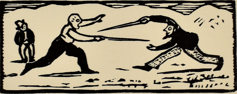 Laage, Wilhelm: Duell. [1912/72]. [Original-Holzschnitt / original woodcut]. Wilhelm Laage, geboren am 16. Mai 1868 in Stellingen bei Hamburg, gestorben 3. Januar 1930 in Ulm, Maler und Holzschneider des Expressionismus.