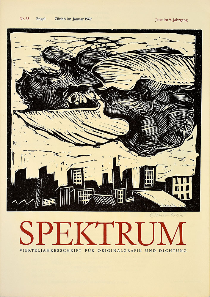 [Grieshaber, HAP]; Knebel, Erwin Sven und Rellstab, Felix [Hrsg.]: Spektrum. Vierteljahresschrift für Originalgraphik und Dichtung. Nr. 33. Engel. Zürich im Januar 1967. 9. Jahrgang. Herausgeben von Felix Rellstab und Erwin Sven Knebel. [Signierte Gönnerausgabe]. Zürich, Spektrum, 1967. 2°. 44,0 x 31,0 cm. [9] Blatt und separate Neujahrsbeilage: Linolschnitt von Axel Hertenstein. Original-Karton.
