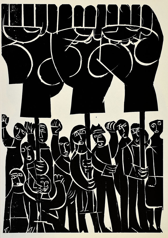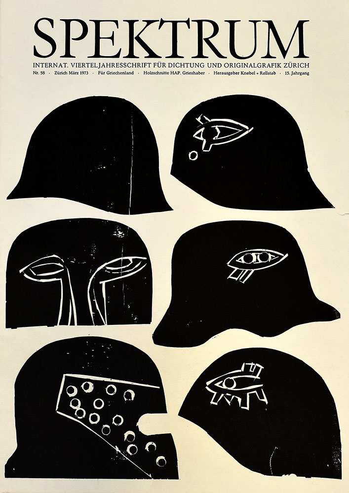 Knebel, Erwin Sven und Rellstab, Felix [Hrsg.]: Spektrum. Vierteljahresschrift für Originalgraphik und Dichtung. Nr. 58. Für Griechenland. Holzschnitte HAP Grieshaber. Zürich März 1973. 15. Jahrgang. Herausgeben von Felix Rellstab und Erwin Sven Knebel. [Signierte Vorzugsausgabe]. Zürich, Spektrum, 1973. 2°. 44,0 x 31,0 cm. [9] Blatt. 1 Blatt Sonderbeilage. Original-Karton.