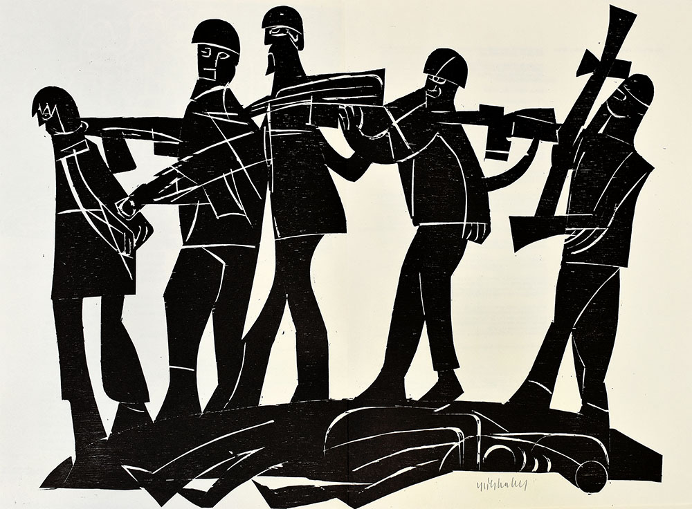 Nummer 101 von 120 nummerierten Exemplaren der Vorzugsausgabe, der sogenannten Gönnerausgabe (mehrheitlich signiert, nummeriert, mit signierten Blättern als Sonderbeilage), hier mit 7, davon einem signierten Original-Holzschnitt, doppelblattgroß von HAP Grieshaber: Soldaten. Texte/Dichtung von Jenny Mastorki, Jannis Ritsos, Giorgis Sarantis, Takis Sinopulos, Vassili Vassilikos, Nikiforos Vrettakos, Günter Dietz, Margarethe Hannsmann, Marie Luise Kaschnitz, Gerd Kalow, Rainer Kirsch, Anise Koltz, Christoph Meckel, Johannes Poethen u. a. Originalgraphiken von HAP Grieshaber. Werkverzeichnis Fürst 73/28-73/34. Vorderdeckel mit kleinem Einriss, ansonsten sehr gutes Exemplar.