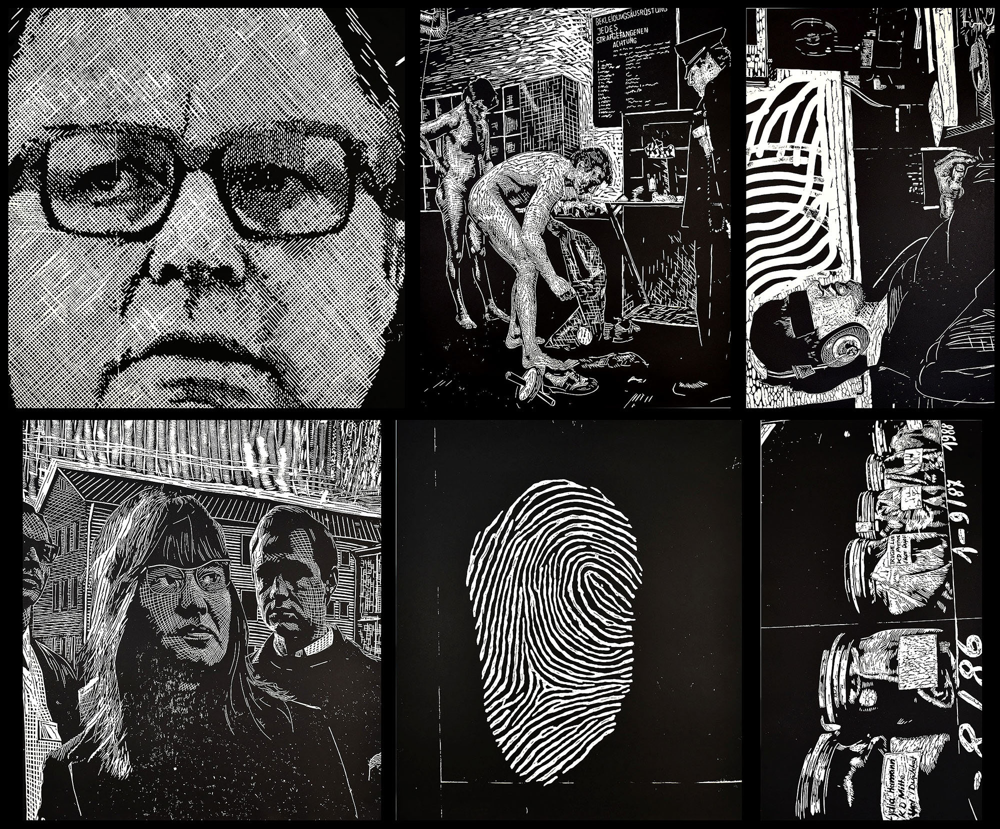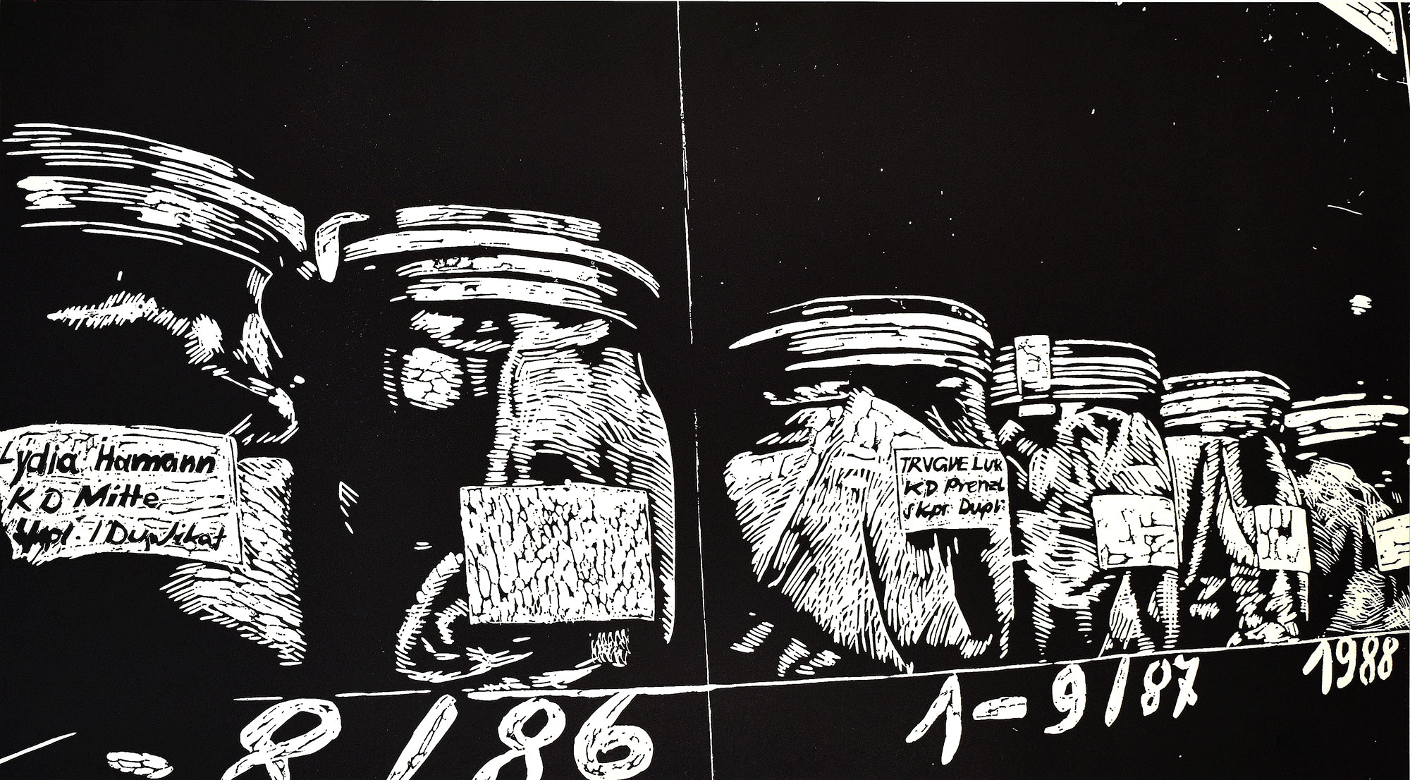 Jede Grafik rückseitig von Thomas Kilpper in Blei signiert. Serie umfasst folgende Blätter: 1. Abhörmethoden des MfS, 1980er Jahre. Maße Blatt/Abbildung: 55,4 x 89,6 cm. 2. Fingerabdruck des Innenministers Wolfgang Schäuble, 2007. Maße Blatt/Abbildung: 77,6 x 67,6 cm. 3. Aufbewahrung von Geruchsproben durch das MfS, 1980er Jahre. Maße Blatt/Abbildung: 48,2 x 89,2 cm. 4. Horst Herold (*1923), BKA-Präsident (1971–1981), Erfinder und Motor zur Anwendung der Rasterfahndung. Maße Blatt/Abbildung: 59,1 x 59,1 cm. 5. Kontrolle Neuzugang in DDR-Gefängnis, 1980er Jahre. Maße Blatt/Abbildung: 88,9 x 69,2 cm. 6. Ulrike Meinhof (*1934 †1976), Besuch im Mädchenerziehungsheim Breitenau, Guxhagen bei Kassel, 1969. Maße Blatt/Abbildung: 77,5 x 69,5 cm.