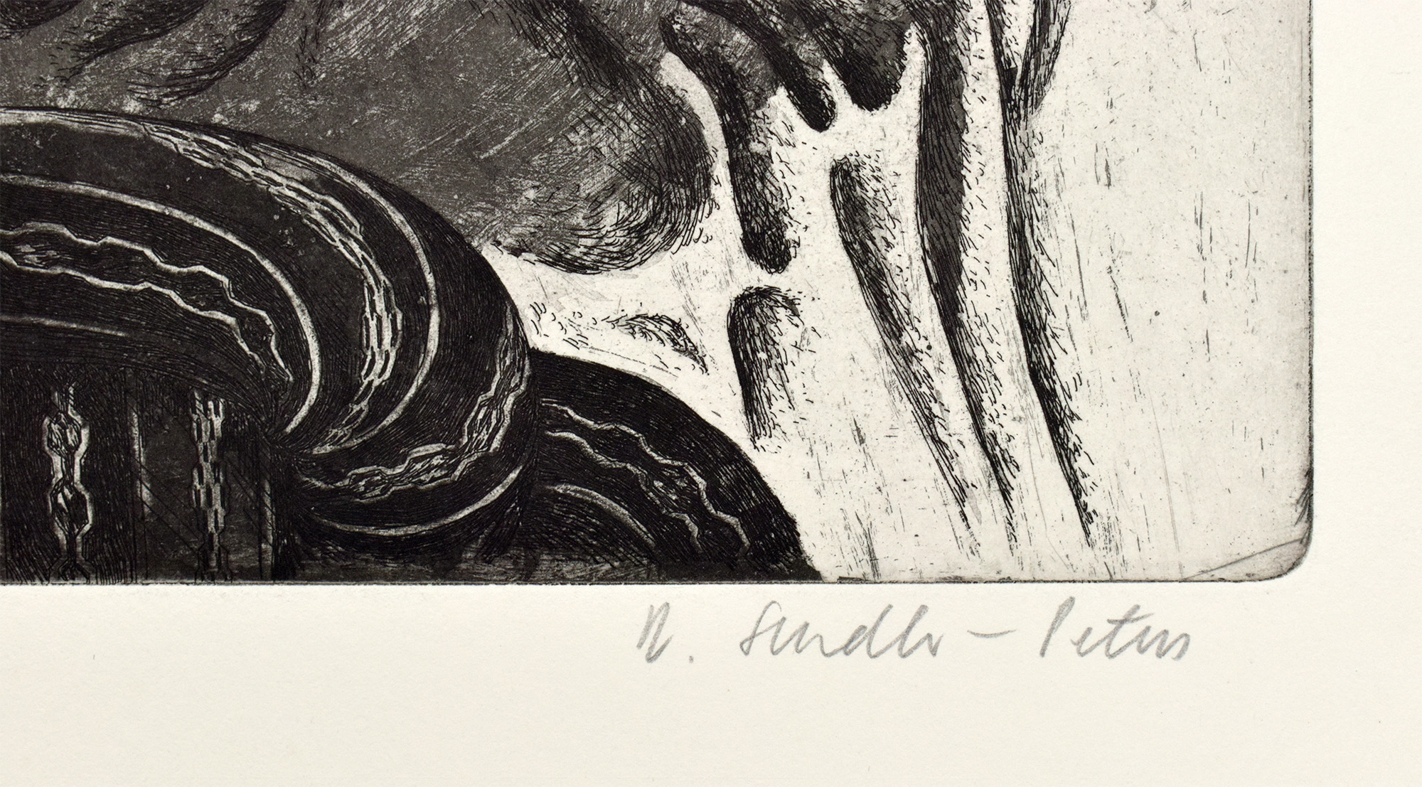 Number 10 of 100 numbered original etchings on handmade paper. Numbered and signed in lead by Renate Sendler-Peters below the image. Sheet dimensions: 54.0 x 38.0 cm. Image dimensions: 34.5 x 25.7 cm. Slight staining in the margins. Overall a very good copy.