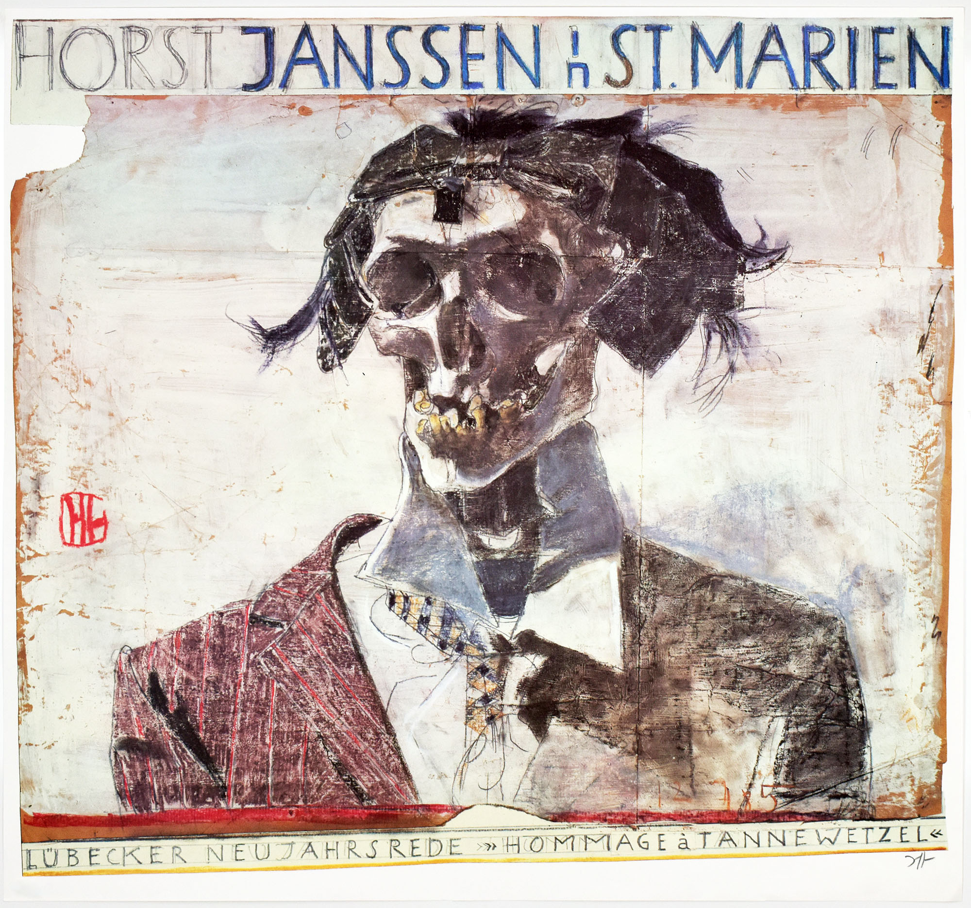Original-Plakat (Farboffsetdruck) auf weißem Papier. Plakat zur Ankündigung der Neujahrsrede von Horst Janssen in der St. Marienkirche zu Lübeck am 01. Januar 1986. Von Horst Janssen unterhalb der Abbildung in Blei signiert. Werkverzeichnis Meyer-Schomann Nr. 155. Maße Blatt: 54 x 57,5 cm. Sehr gutes Exemplar.