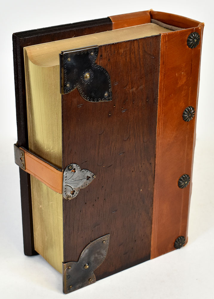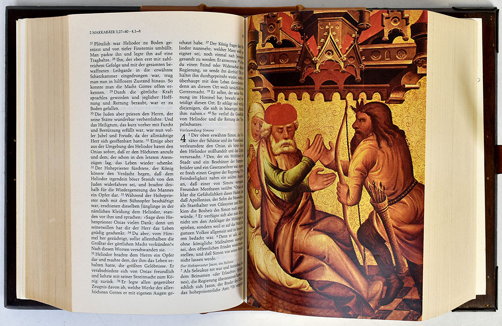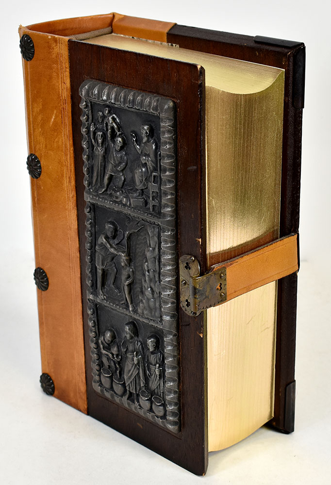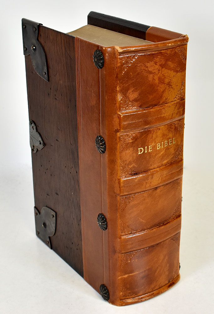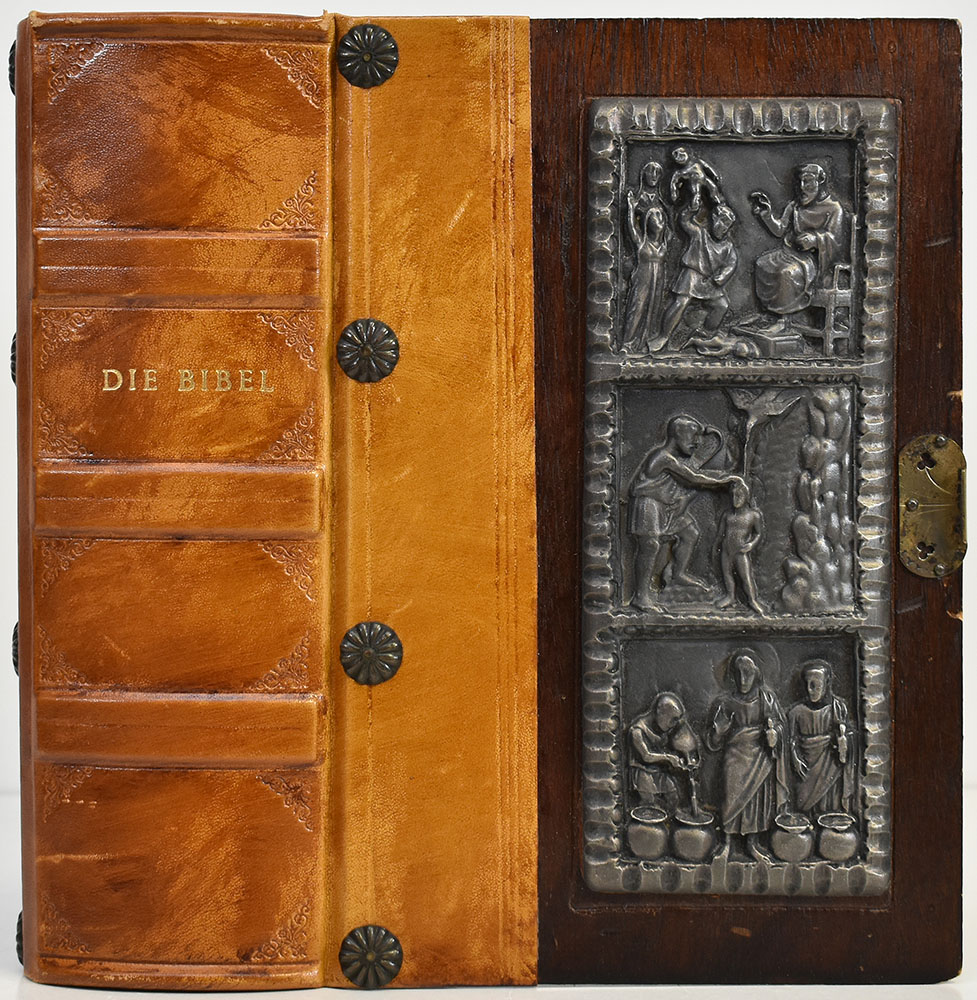 Hamp, Prof. Dr. Vinzenz; Stenzel, Prof. Dr. Meinrad und Kürzinger, Prof. Dr. Josef [Hrsg]: Die Heilige Schrift des Alten und Neuen Testamentes. Vollständige Ausgabe, nach den Grundtexten übersetzt und herausgegeben von Prof. Dr. Vinzenz Hamp, Prof. Dr. Meinrad Stenzel, Prof. Dr. Josef Kürzinger. Aschaffenburg, Paul Pattloch Verlag, 1981. Groß-8°. 24 cm x 16 cm. 1559 Seiten in getrennter Zählung. Original-Halblederband über Holz auf 3 Bünden mit dreiteiligem, biblischem Metallrelief auf Vorderdeckel und insgesamt 8 ornamentalen Metallnägeln an den Außenfalzen sowie 2 Eckenbeschlägen. Metallschließe mit Ledergurt. Goldschnitt.