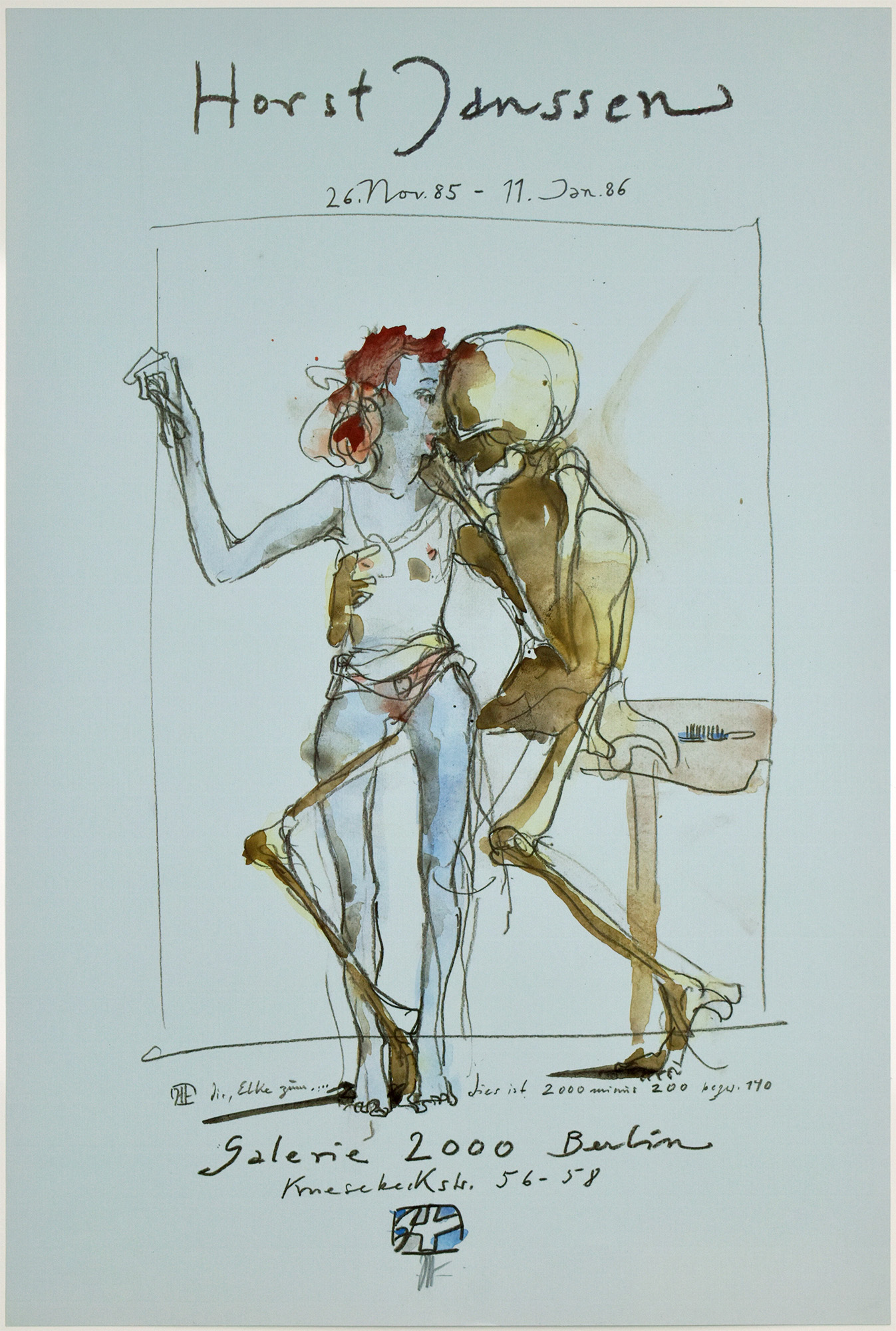 Original-Plakat (Farboffsetdruck) auf grauem Büttenkarton. Plakat zur Janssen-Ausstellung in der Galerie 2000, Berlin November 1985- Januar 1986. Von Horst Janssen unterhalb der Abbildung in Blei signiert. Werkverzeichnis Meyer-Schomann Nr. 154. Maße Blatt: 69 x 46 cm. Sehr gutes Exemplar.